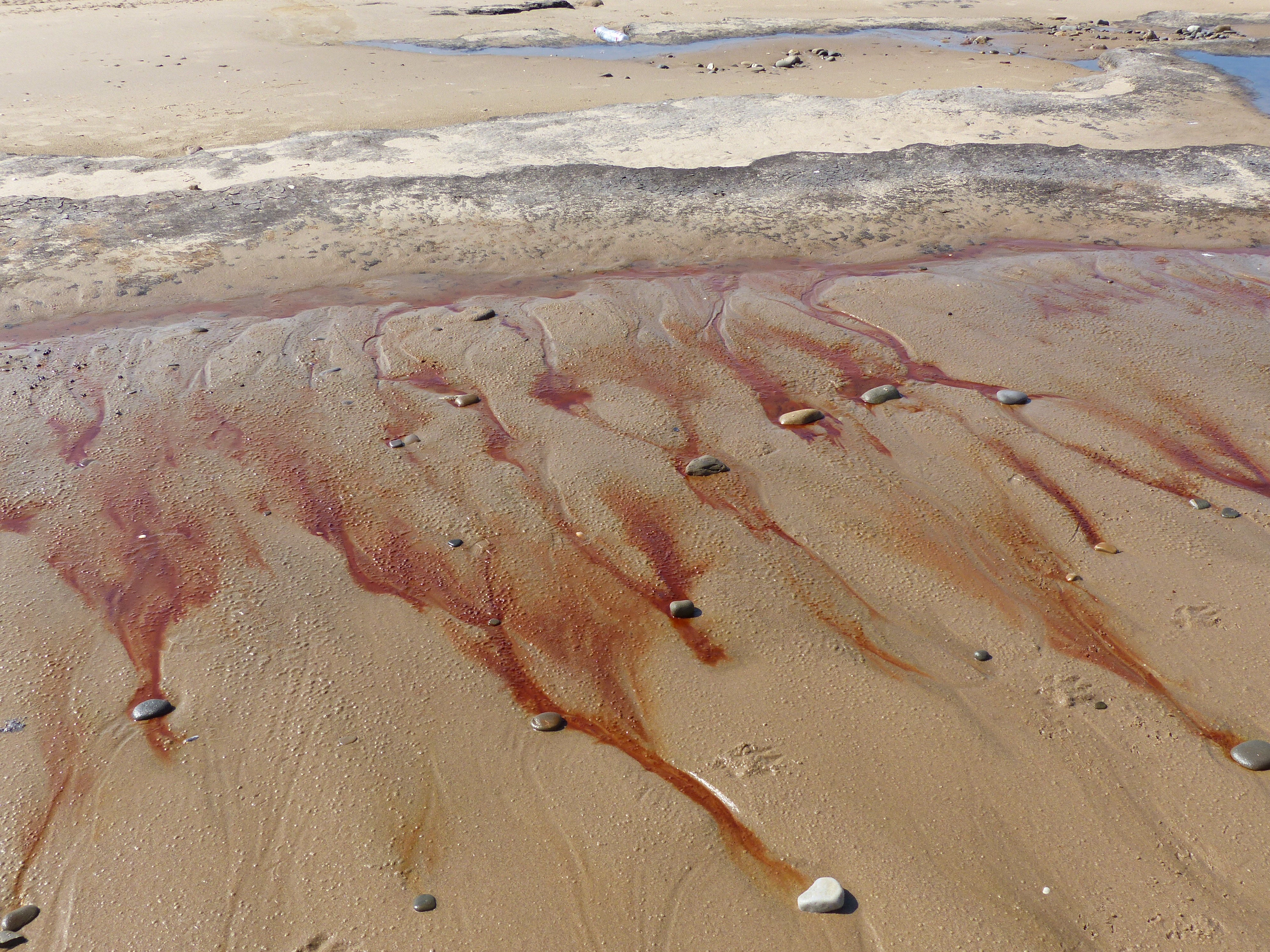 Iron-stained water seeping through the sand from an iron pan on ancient buried peat deposits at Whiteford Sands on the Gower Peninsula in South Wales.