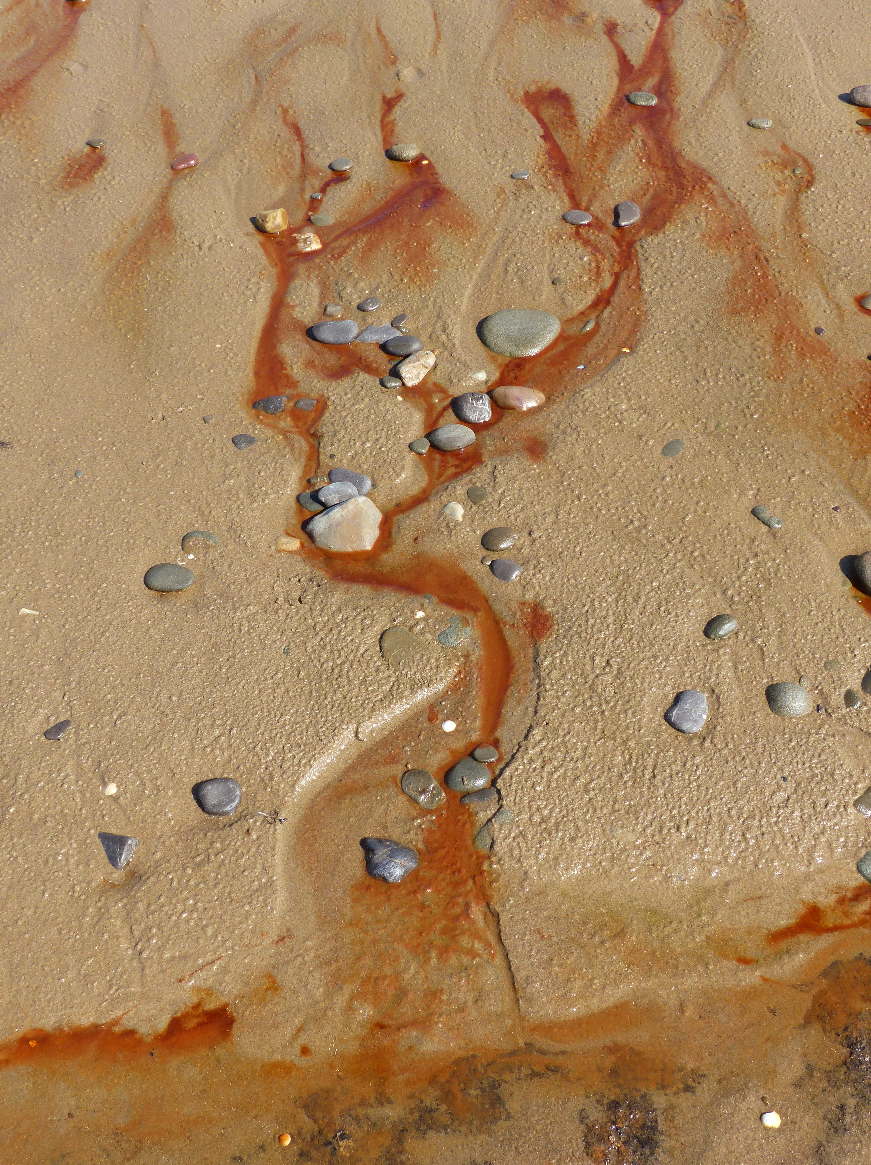 Iron-stained water seeping through the sand from an iron pan on ancient buried peat deposits at Whiteford Sands on the Gower Peninsula in South Wales.