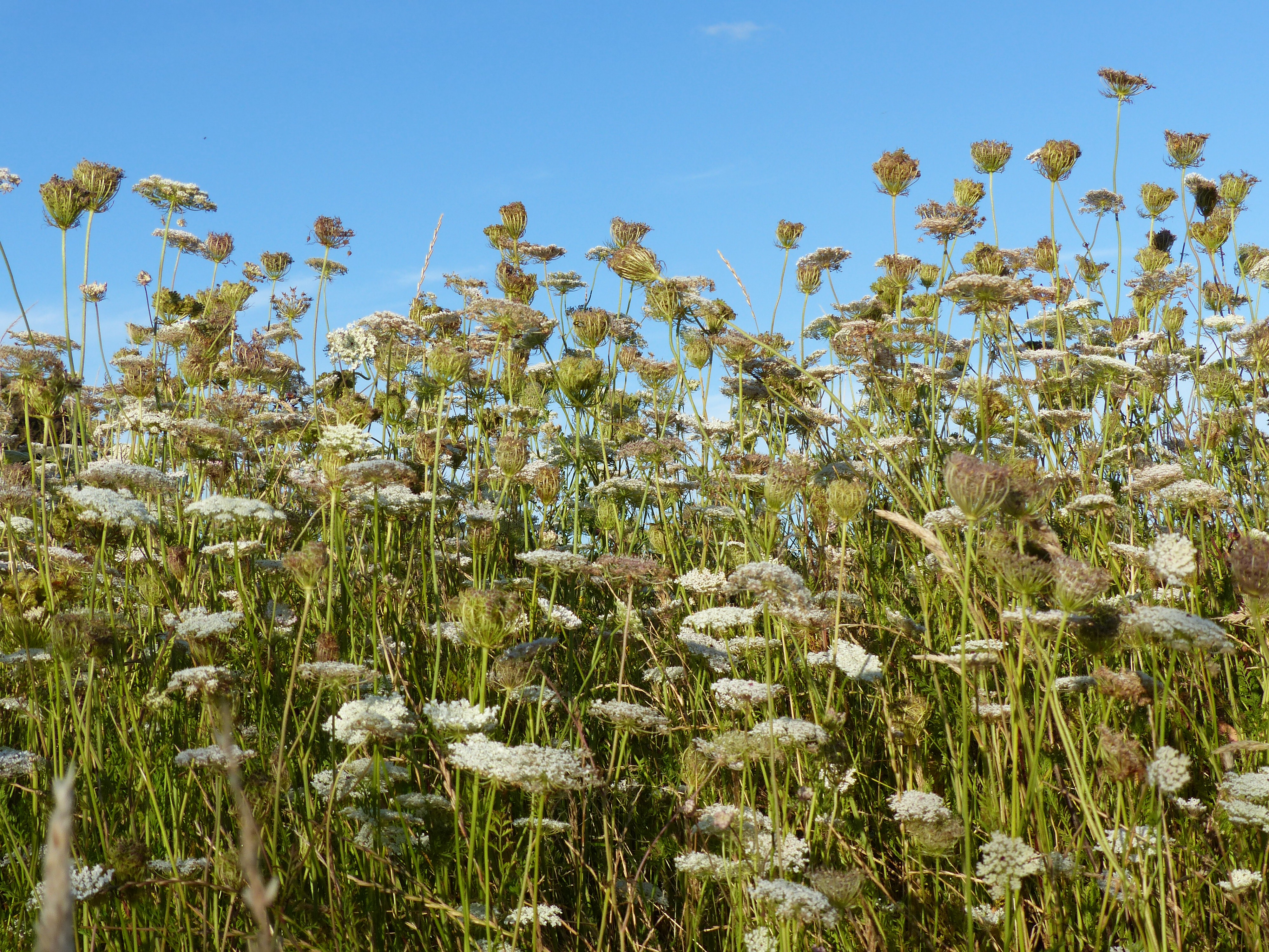 White flowers of wild carrot in Nitten Field, Gower, planted especially to encourage insects in summer, and to provide seeds for birds in winter, August 2015.
