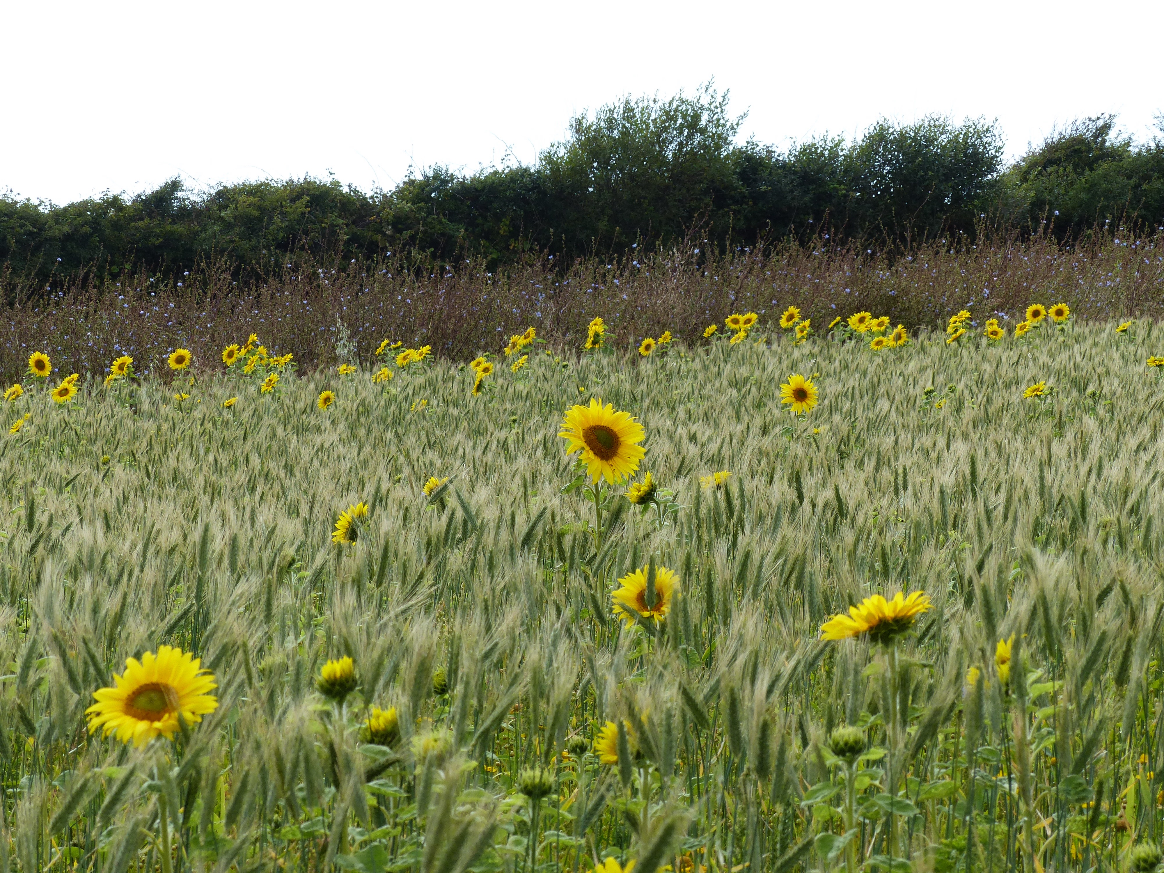 Sunflowers and hybrid barley in Nitten Field, Gower, South Wales, especially planted to encourage insects in summer and to provide seeds for wild birds in winter. August 2015.