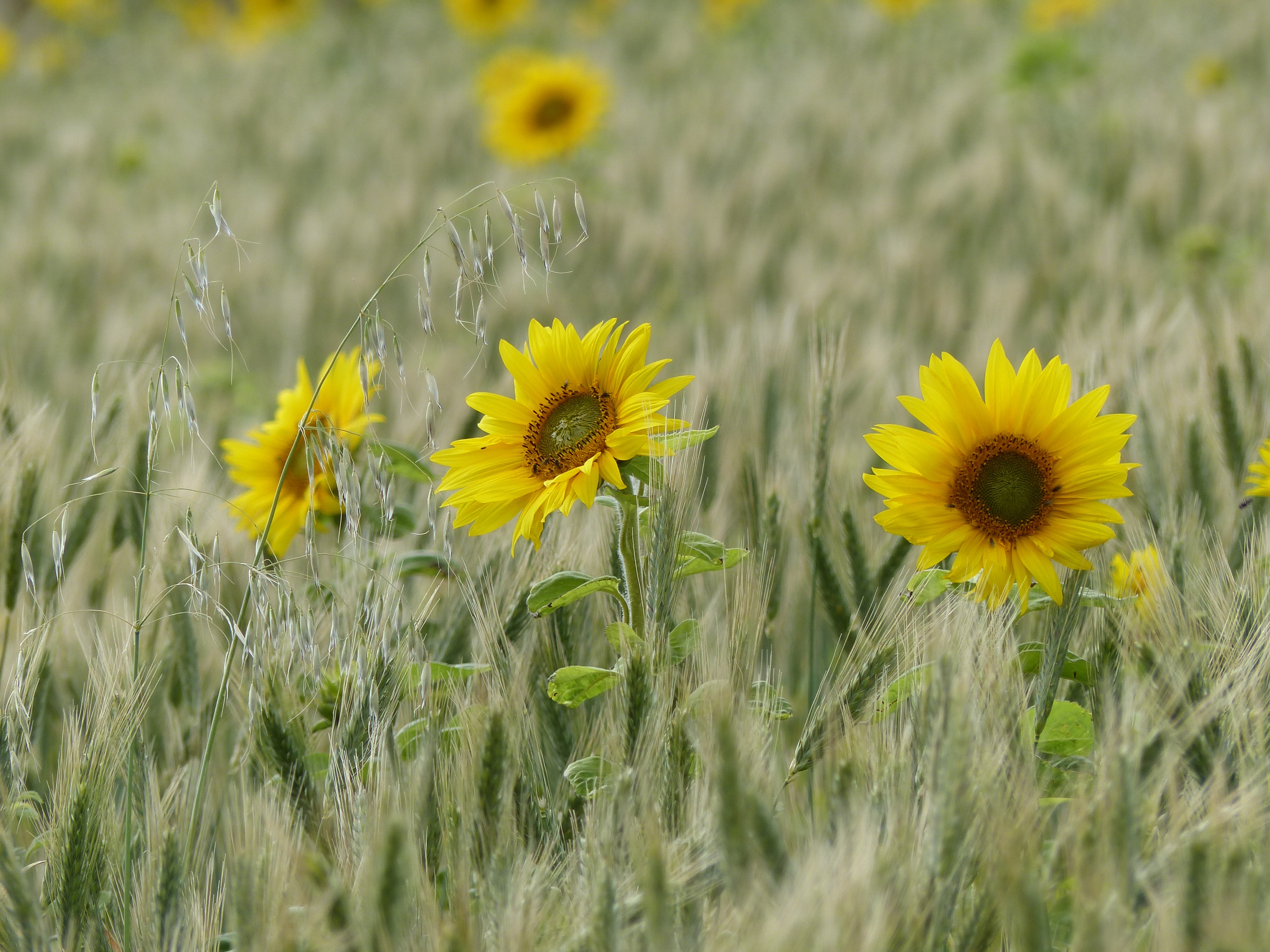 Sunflowers and hybrid barley in Nitten Field, Gower, South Wales, especially planted to encourage insects in summer and to provide seeds for wild birds in winter. August 2015.