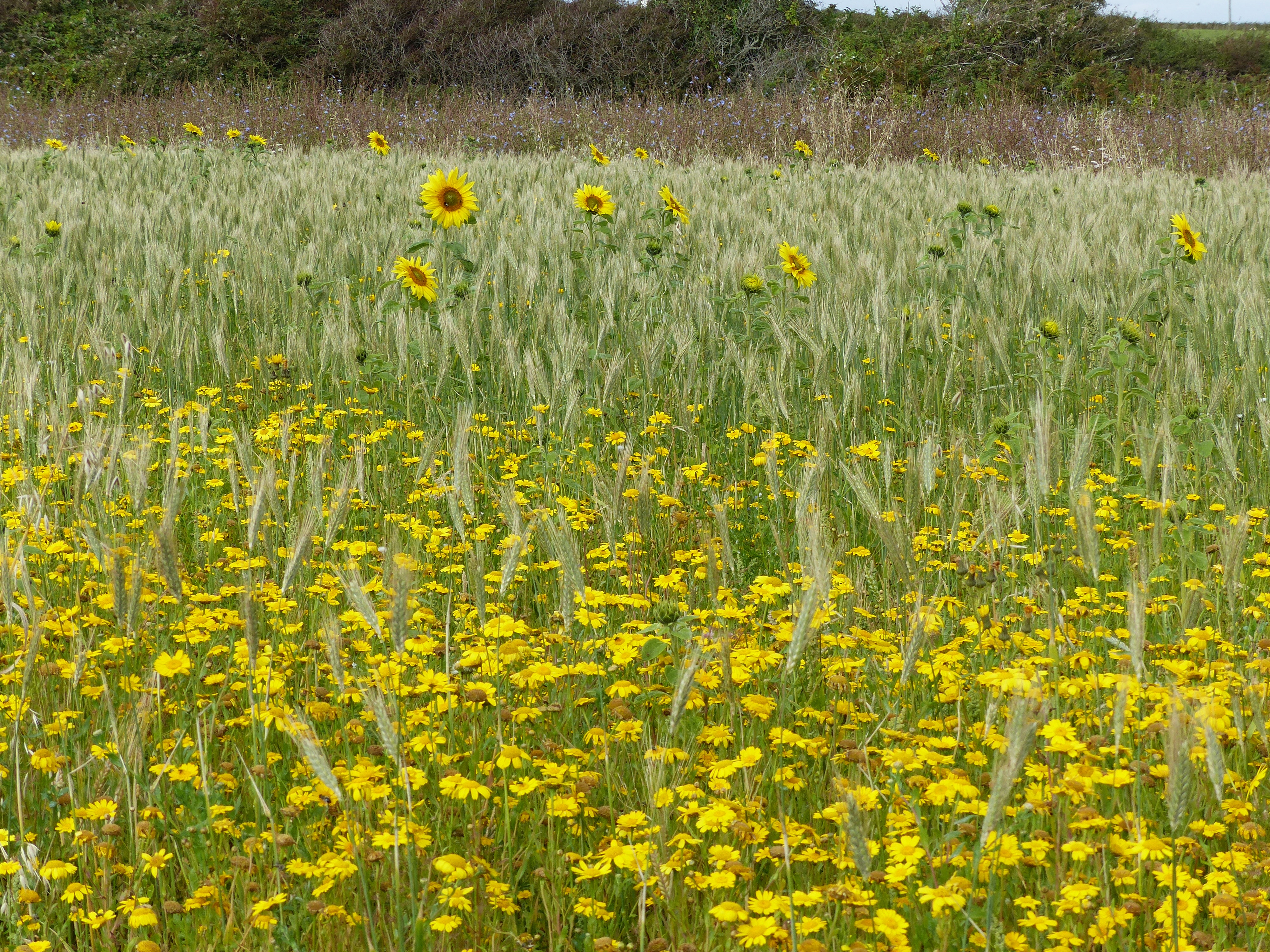 Sunflowers, corn marigolds, and hybrid barley in Nitten Field, Gower, South Wales, especially planted to encourage insects in summer and to provide seeds for wild birds in winter. August 2015.