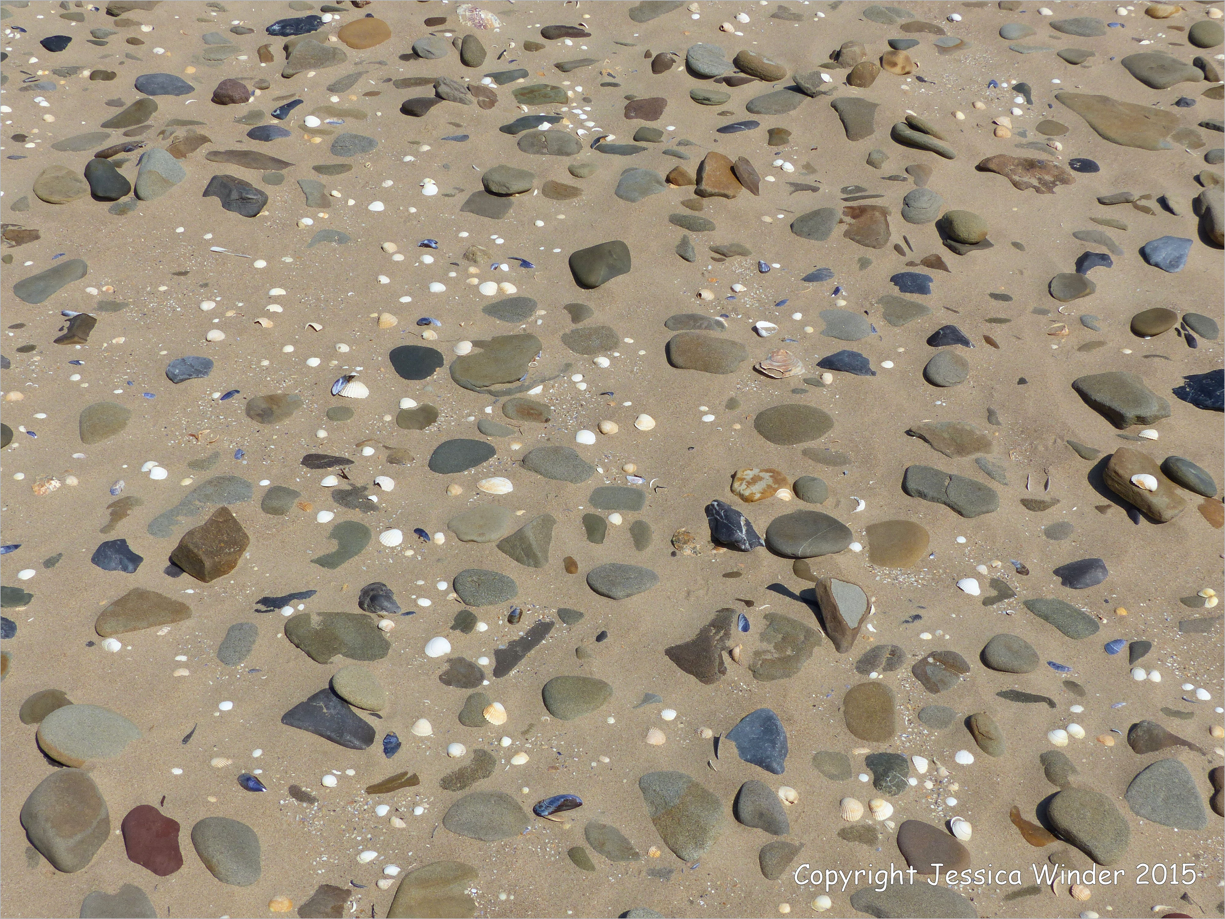 Whiteford Point Pebbles 18 – Partially sand-covered pebbles and shells at Whiteford Point, Gower, South Wales. Many of the pebbles are thought to have been derived from a deposit of material from a melting ice sheet in the Devensian Period.