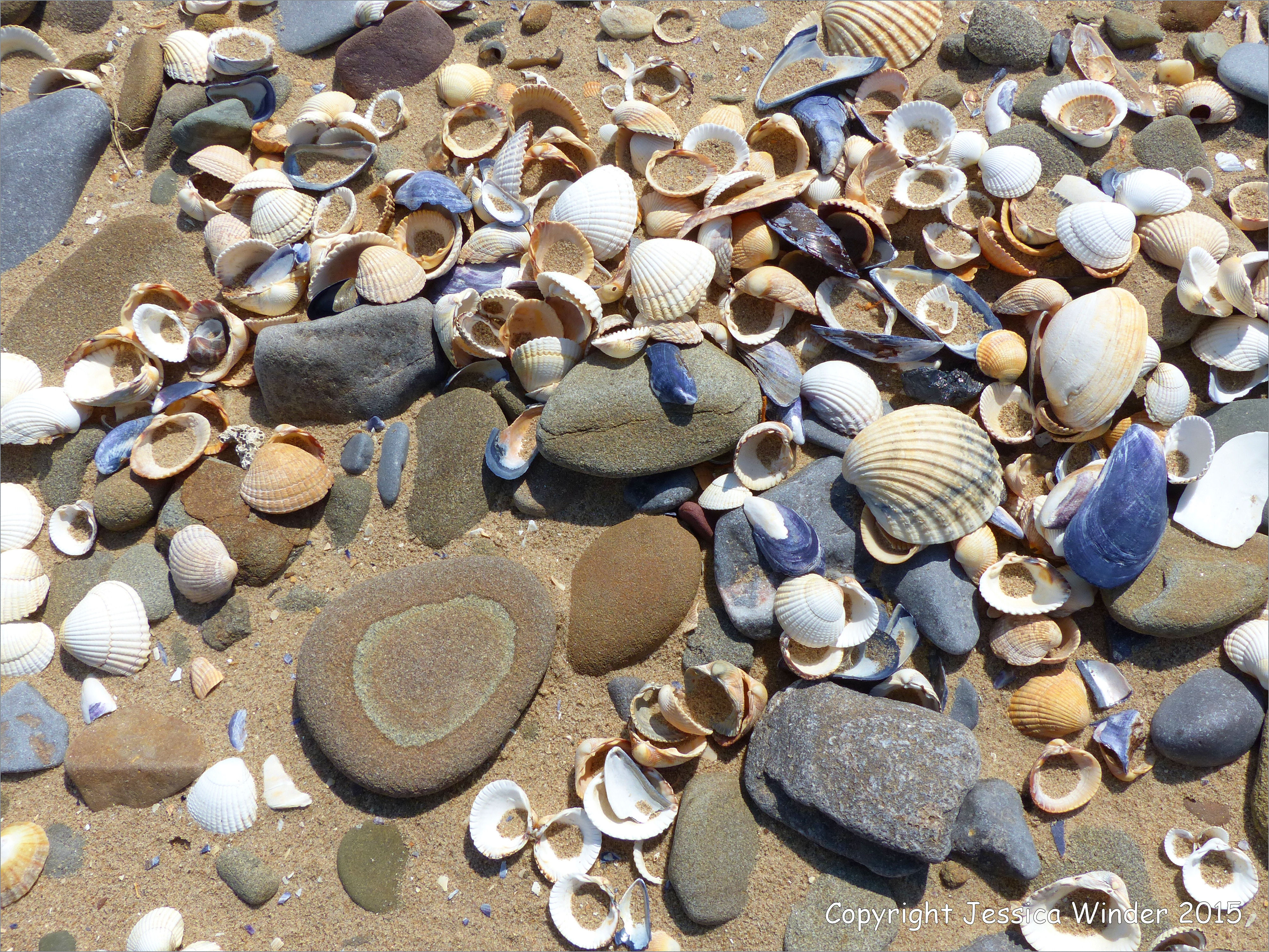 Whiteford Point Pebbles 3 – Partially sand-covered pebbles and shells at Whiteford Point, Gower, South Wales. Many of the pebbles are thought to have been derived from a deposit of material from a melting ice sheet in the Devensian Period.