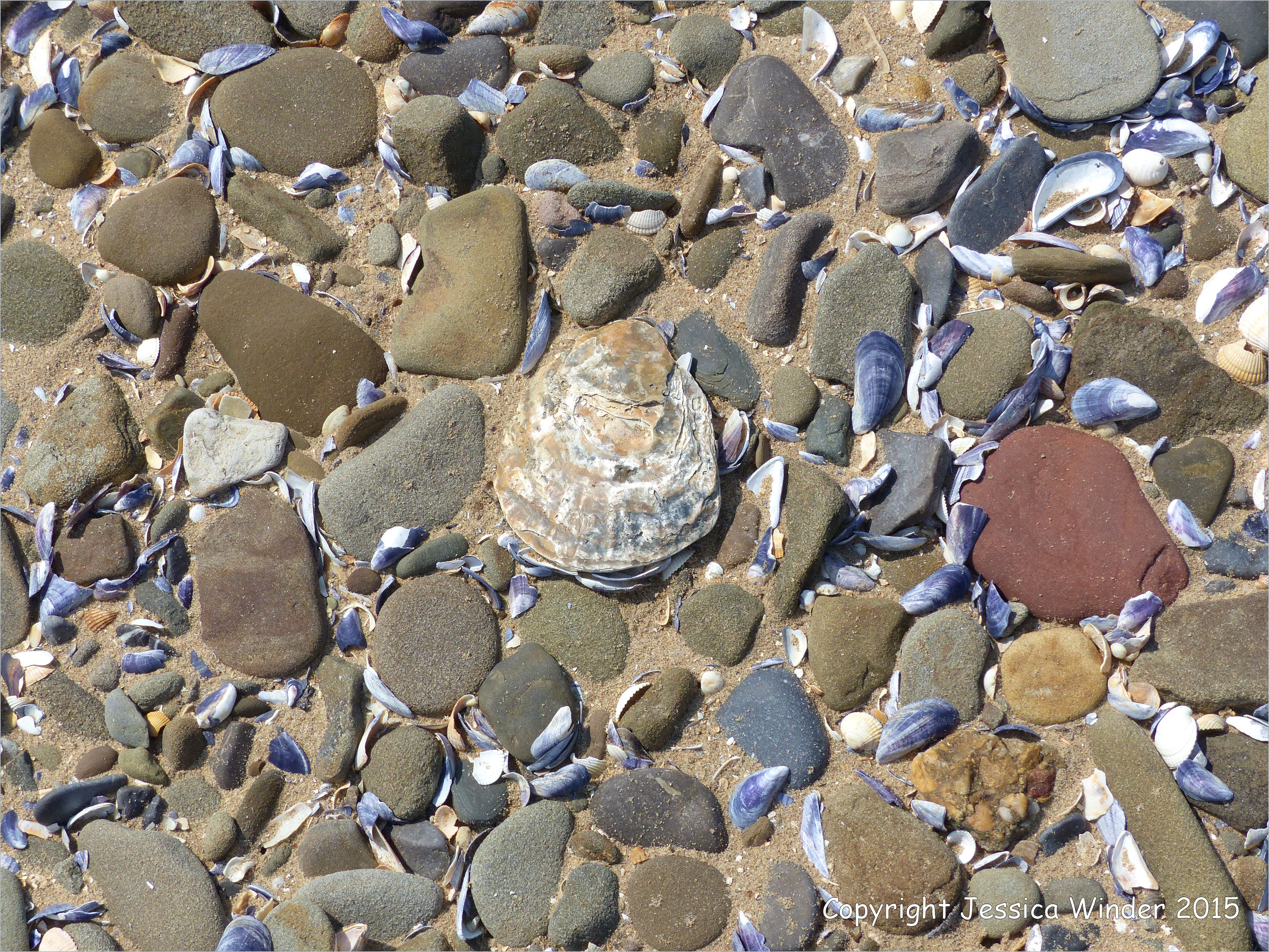 Whiteford Point Pebbles 9 – Partially sand-covered pebbles and shells at Whiteford Point, Gower, South Wales. Many of the pebbles are thought to have been derived from a deposit of material from a melting ice sheet in the Devensian Period.