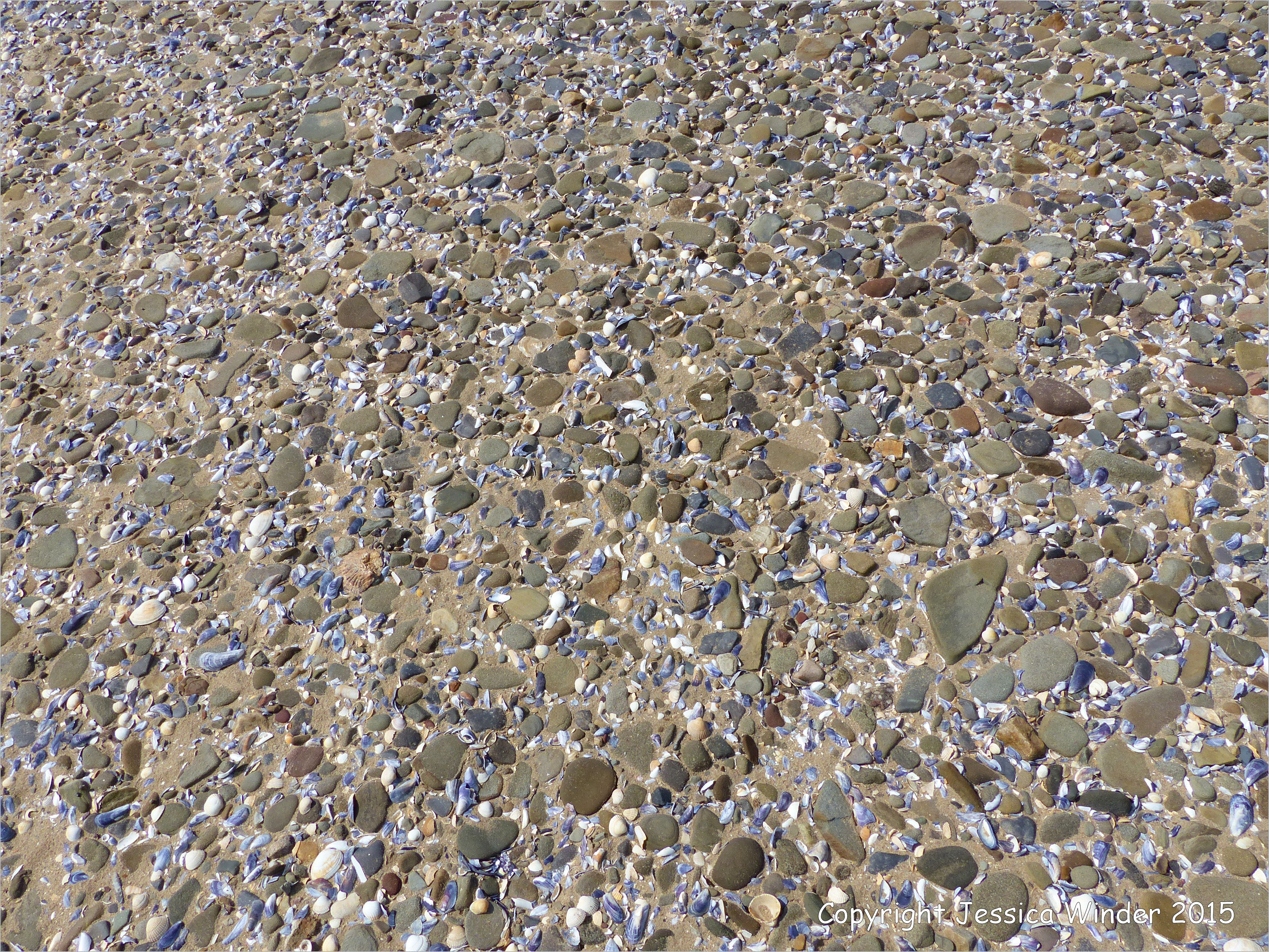 Whiteford Point Pebbles 20 – Partially sand-covered pebbles and shells at Whiteford Point, Gower, South Wales. Many of the pebbles are thought to have been derived from a deposit of material from a melting ice sheet in the Devensian Period.
