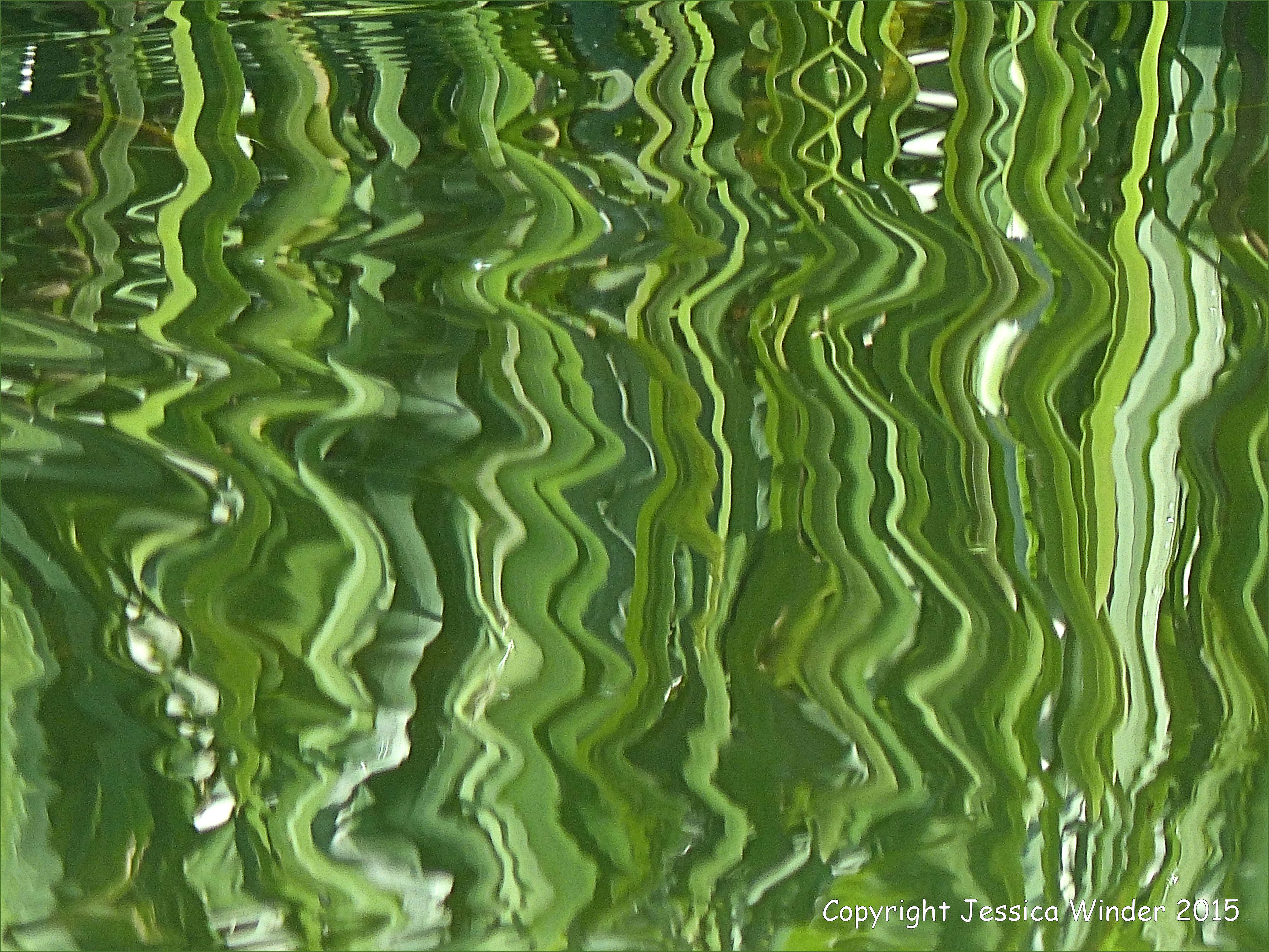 Reedy Reflections 8 – Reflections of reeds on the edge of a pond in the park, occasionally disturbed and distorted by the bow waves and wake ripples of ducks swimming past.