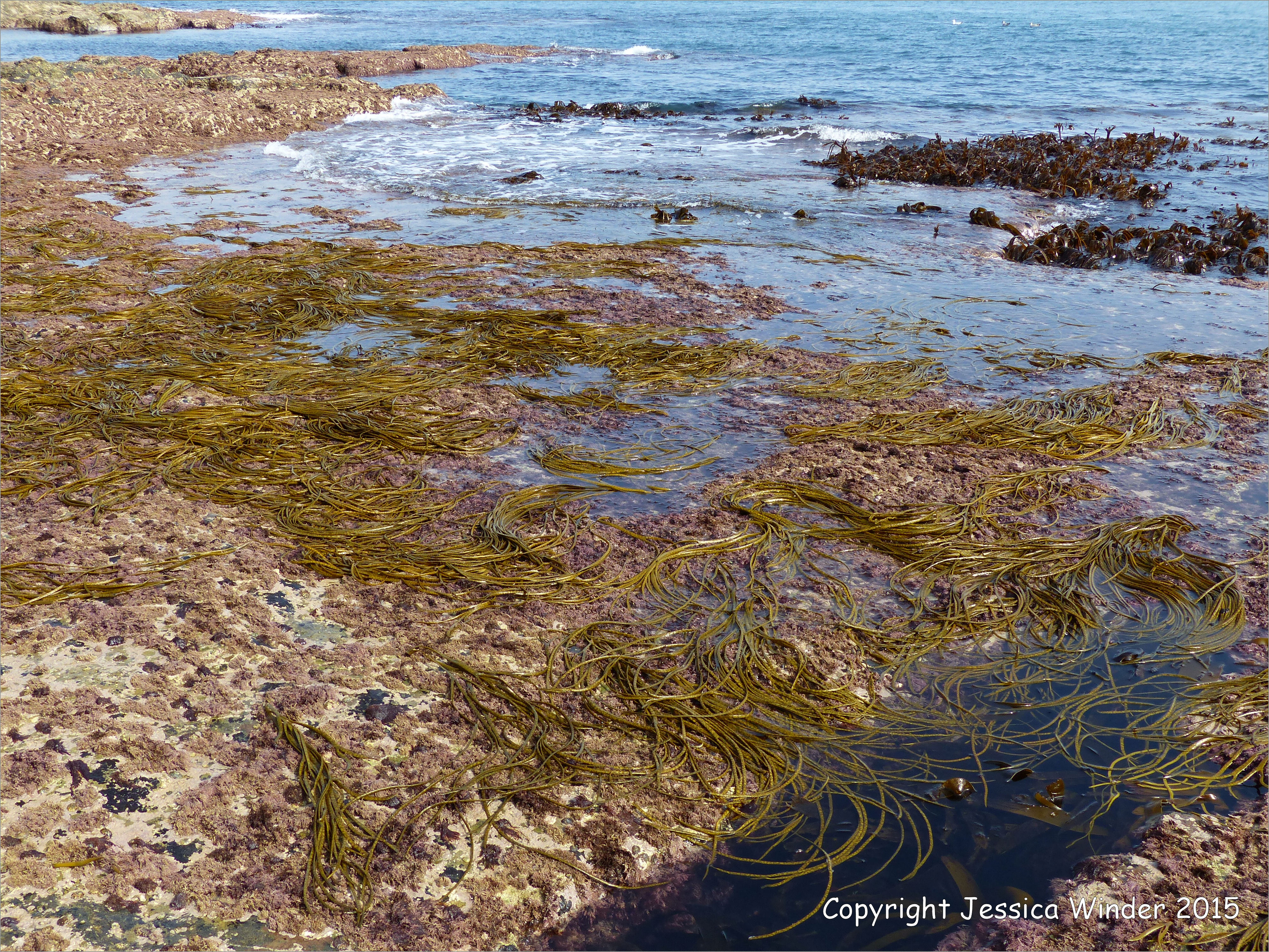 Winspit Thongweed 3 – Long strands of the olive green seaweed Himanthalia elongata, commonly known as Thongweed, growing at low tide level on the rocky limestone ledges at Winspit in Dorset, England, 30th August 2015.