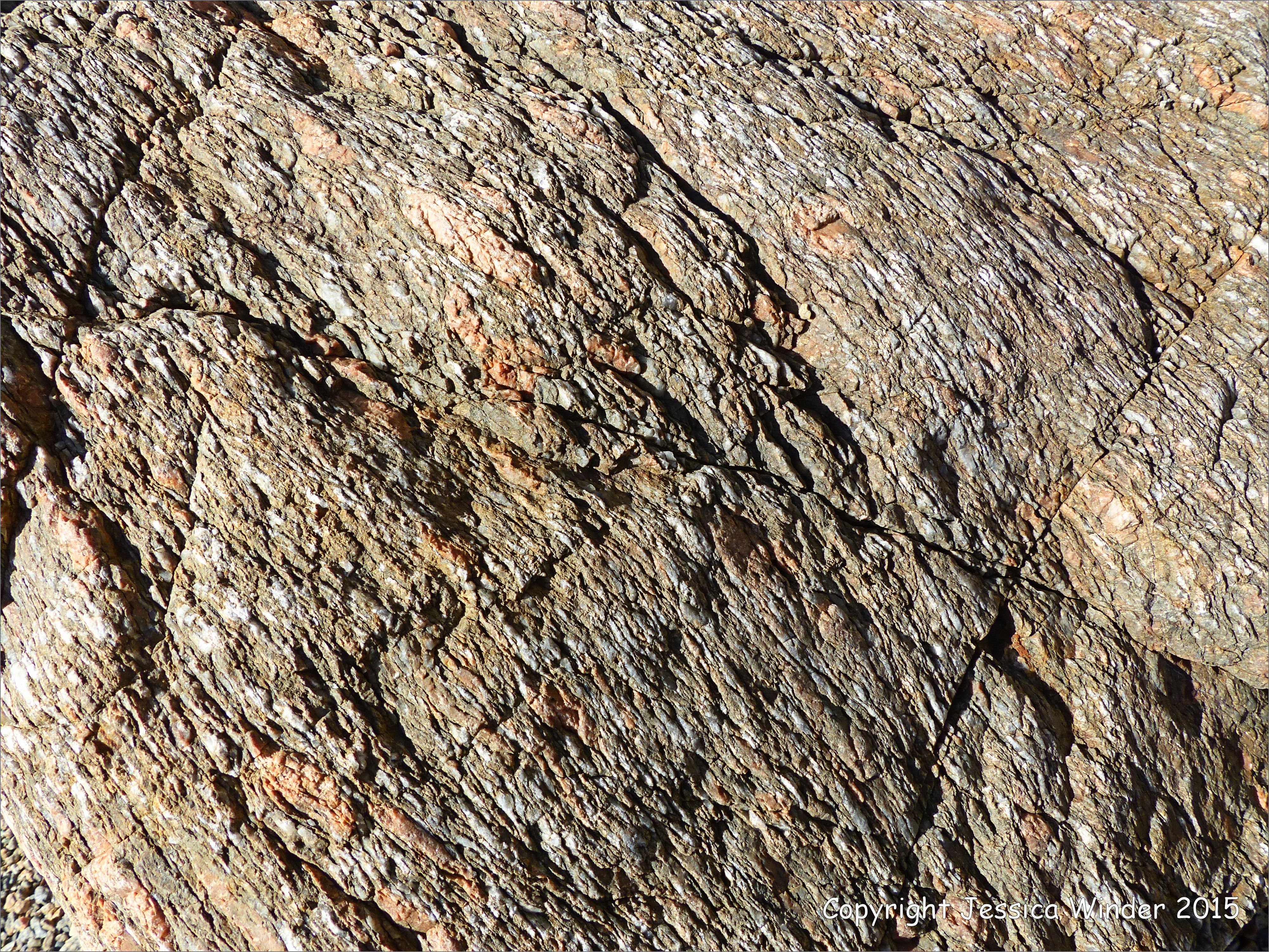 Moulin Huet Icart Gneiss 8 – Icart Gneiss metamorphosed granite rock dating from between 2000 and 2500 million years ago in the Proterozoic Period at Moulin Huet Bay in the Channel Island of Guernsey