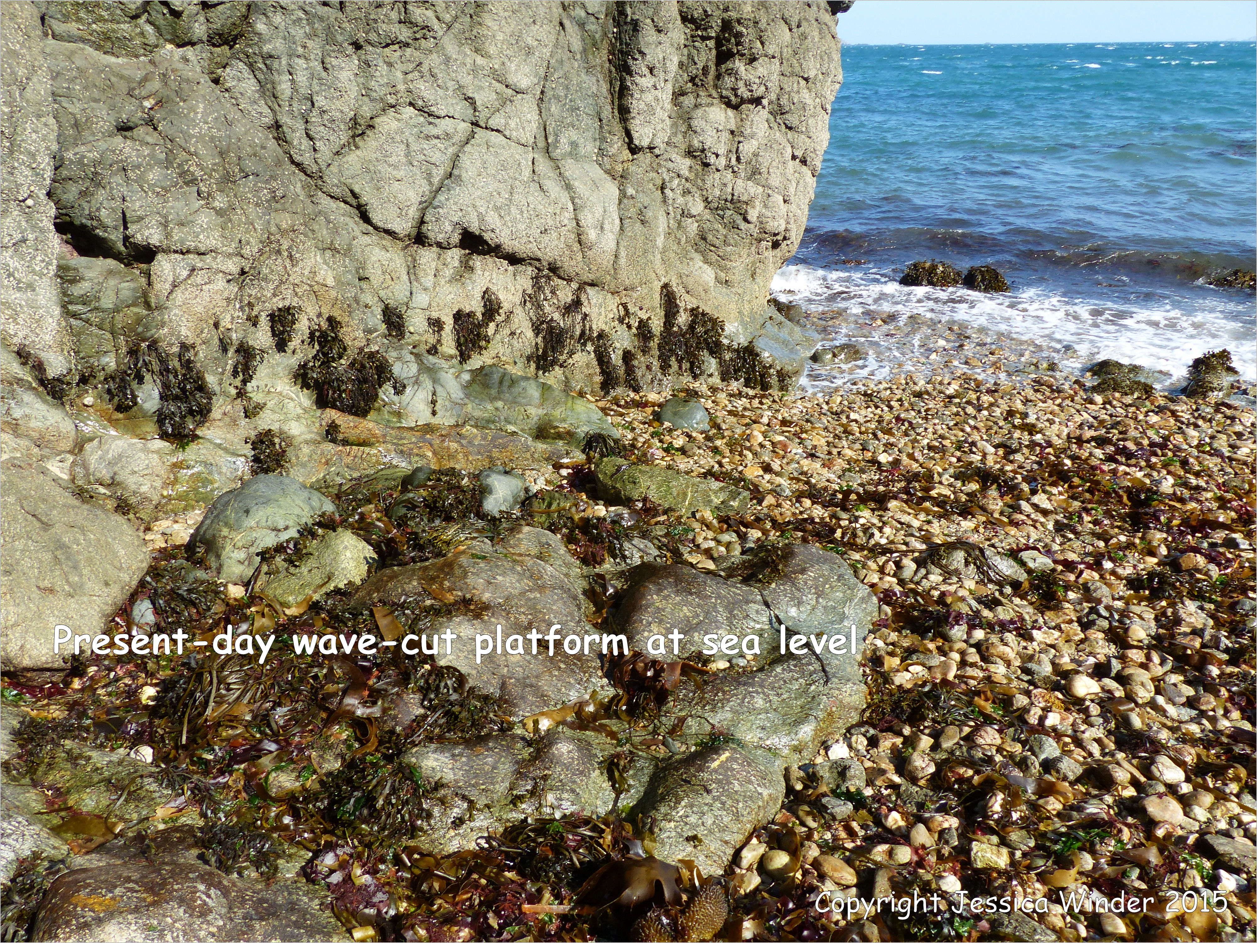Marble Bay or Pied Du Mur 9 – Present day wave-cut platform beneath the pebbles at Marble Bay (Pied du Mur) on the Jerbourg Peninsula on the Channel Island of Guernsey.