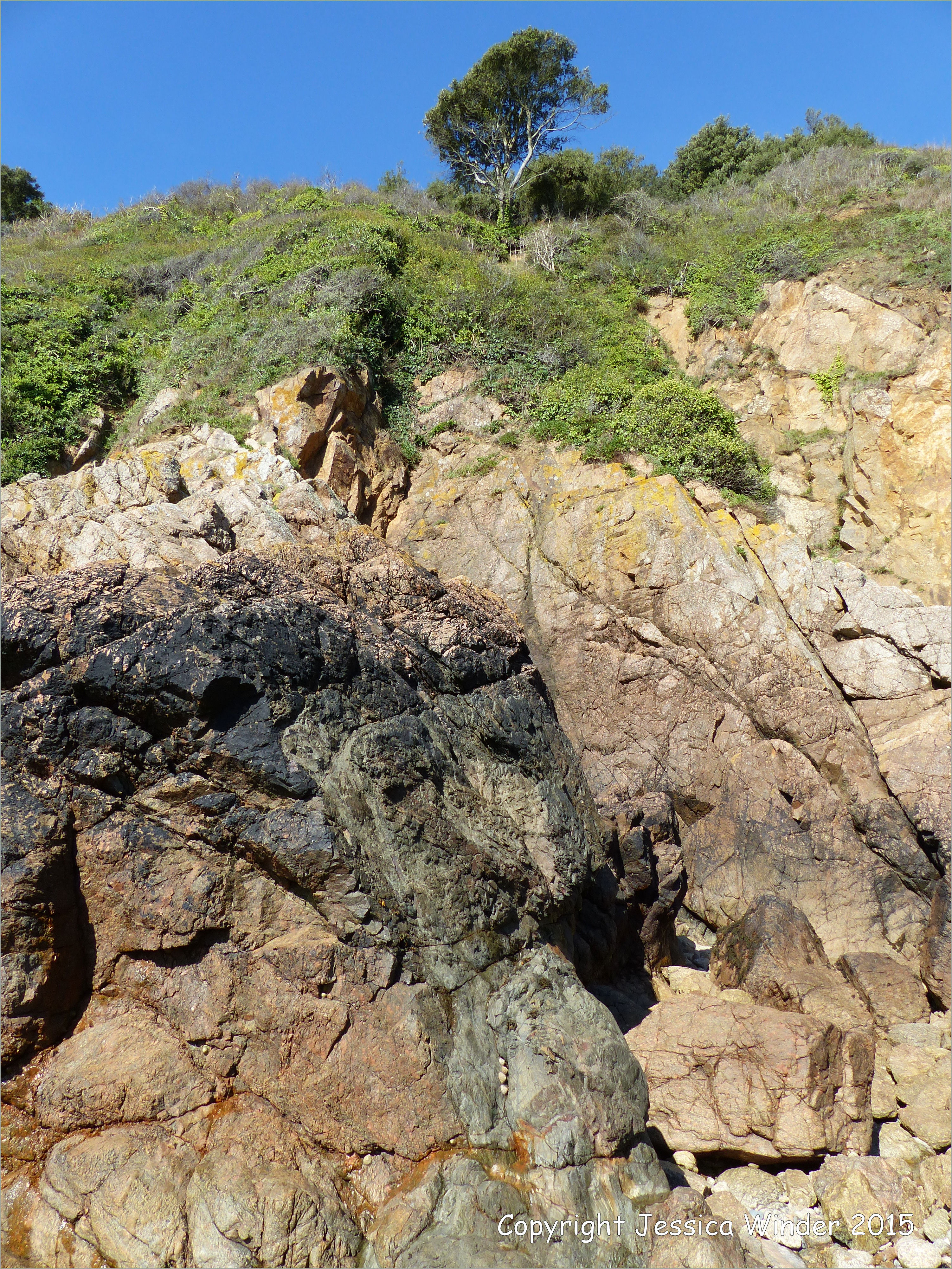 Dolerite Dyke In Icart Gneiss 8 – Contrasting rock textures at Moulin Huet Bay, Guernsey, Channel Islands, between coarse-grained Icart Gneiss bedrock with its squashed orange feldspar crystals and an intrusive dolerite dyke with its smooth, grey-green homogenous texture.