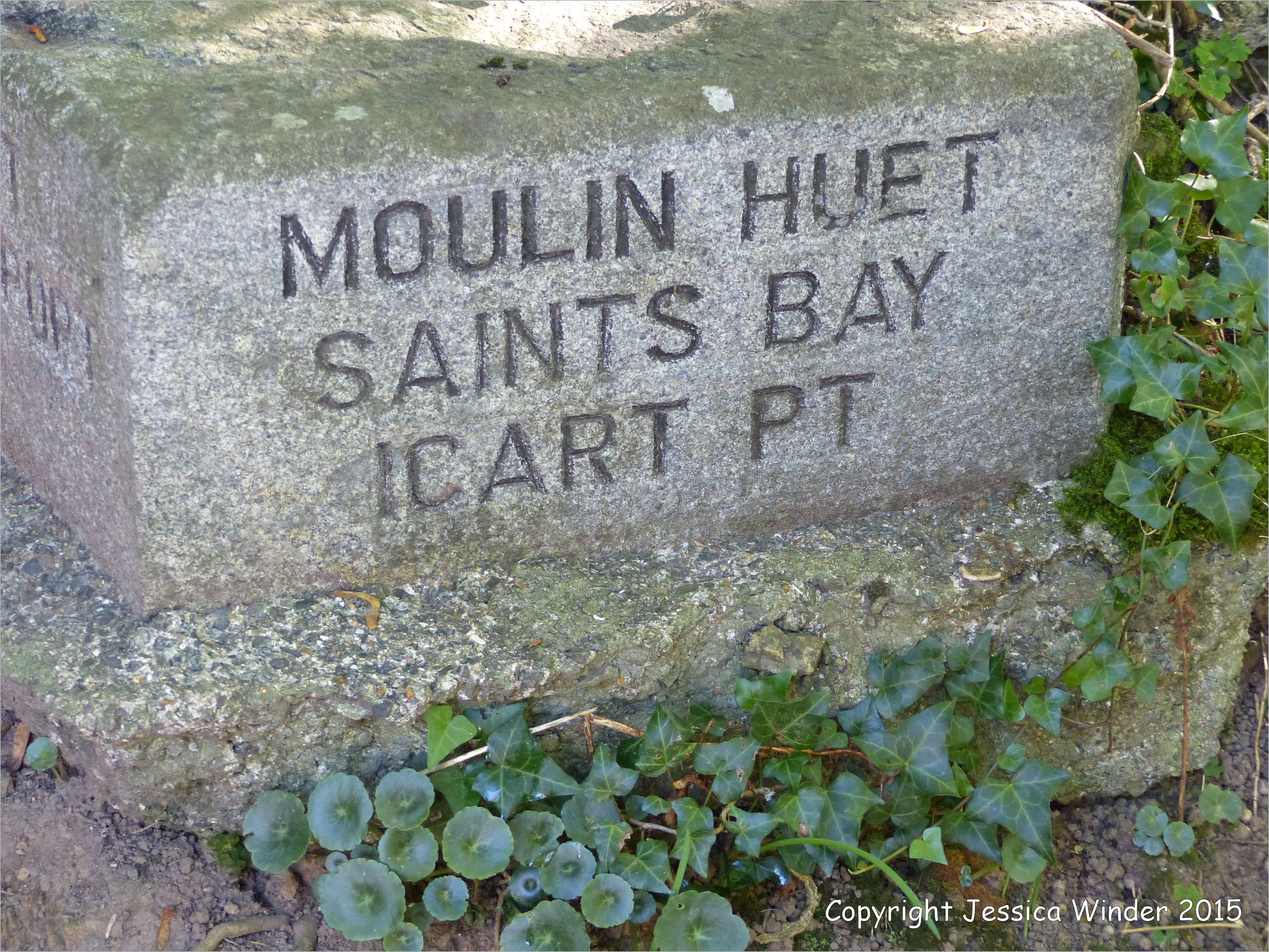 Moulin Huet & Pea Stacks 1 – Granite footpath sign to Moulin Huet Bay on the south coast of Guernsey in the Channel islands