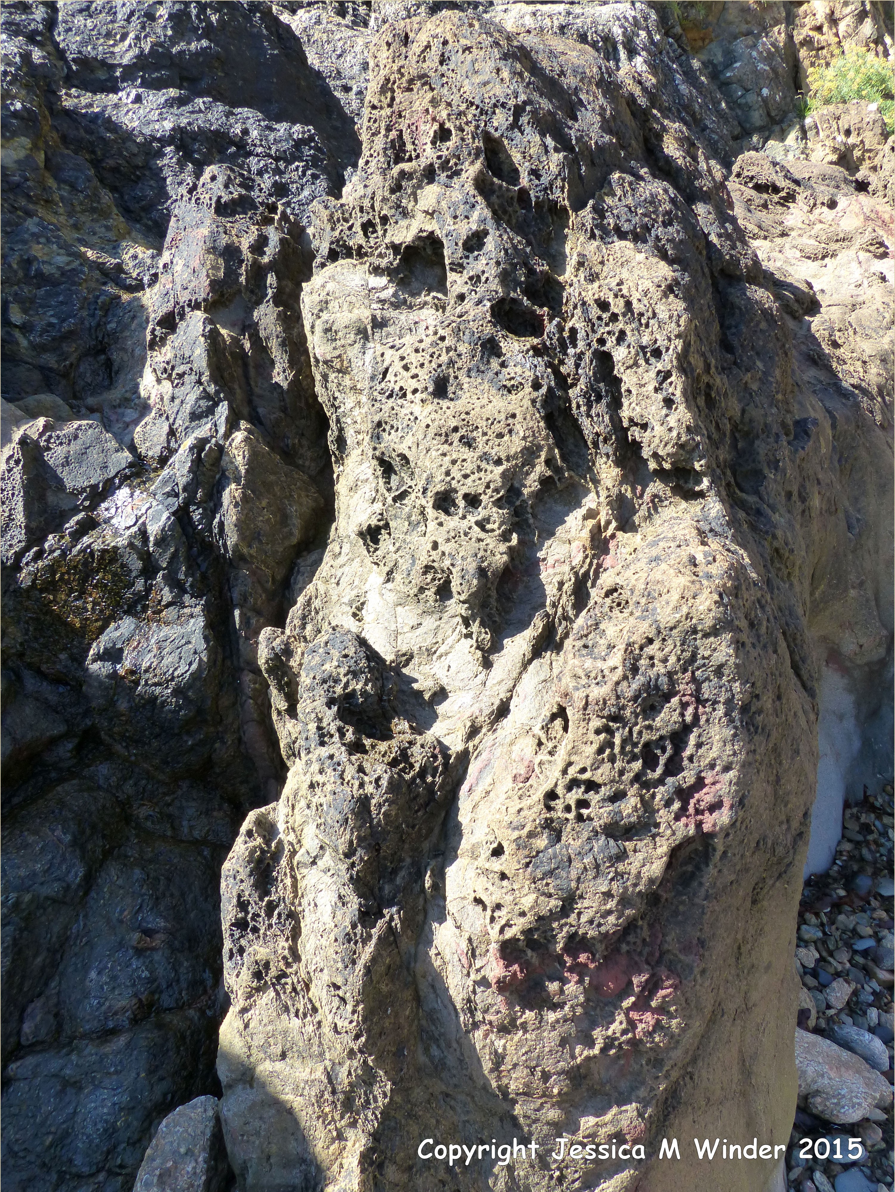 Lamprophyre Dyke at Moulin Huet 9 – Strange natural honeycomb textures in the weathering surface of a lamprophyre dyke (right of image) cutting through Icart Gneiss (left of image) at Moulin Huet Bay in the Southern Metamorphic Complex on the Channel Island of Guernsey.