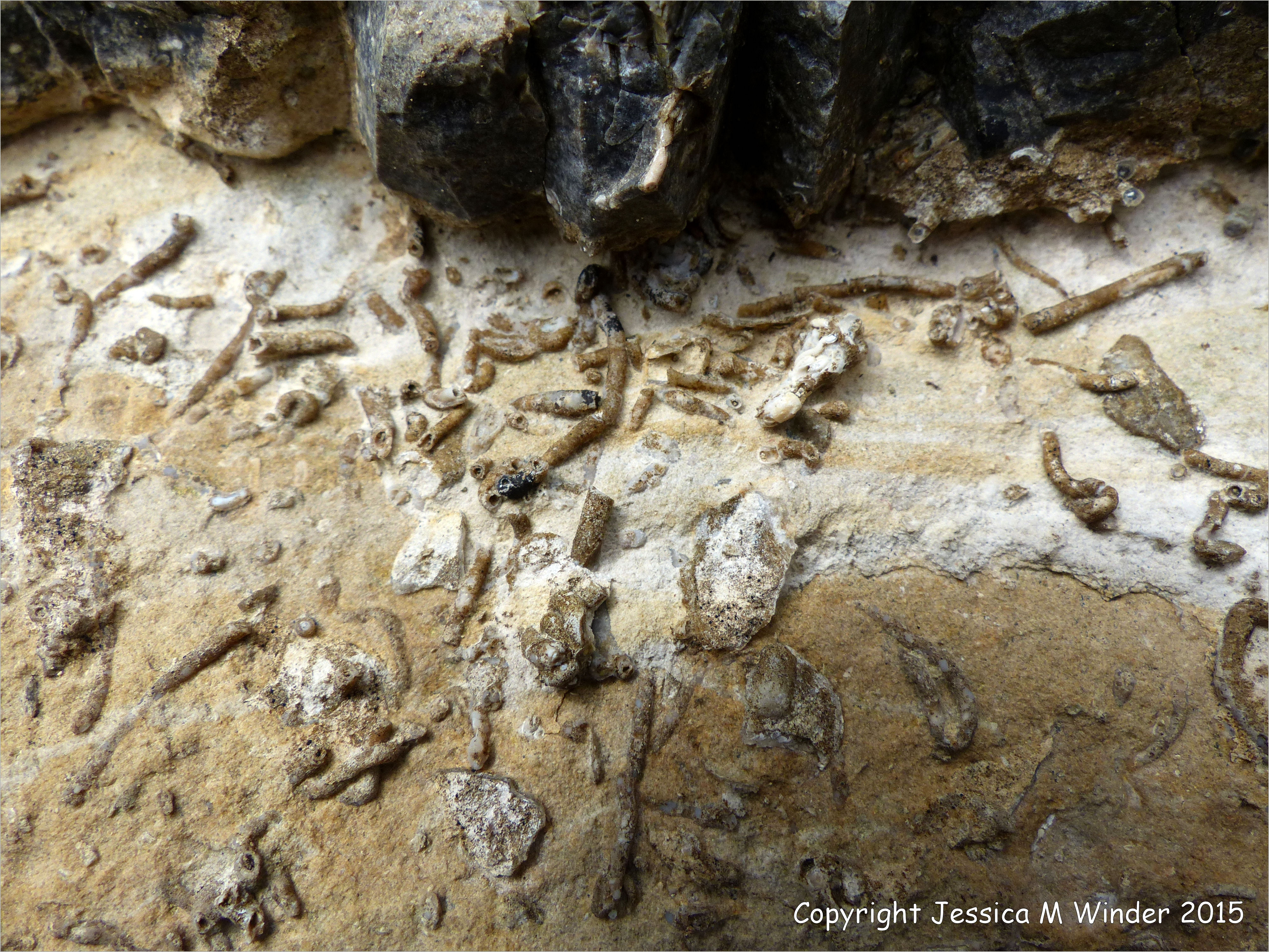Winspit Serpulid Fossils 5 – Worm tube fossils, thought to be the serpulid worm Glomerula gordialis, in a boulder of Jurassic Portland Chert Member of the Portland Stone Formation, on the ledge at Winspit in Dorset, England.