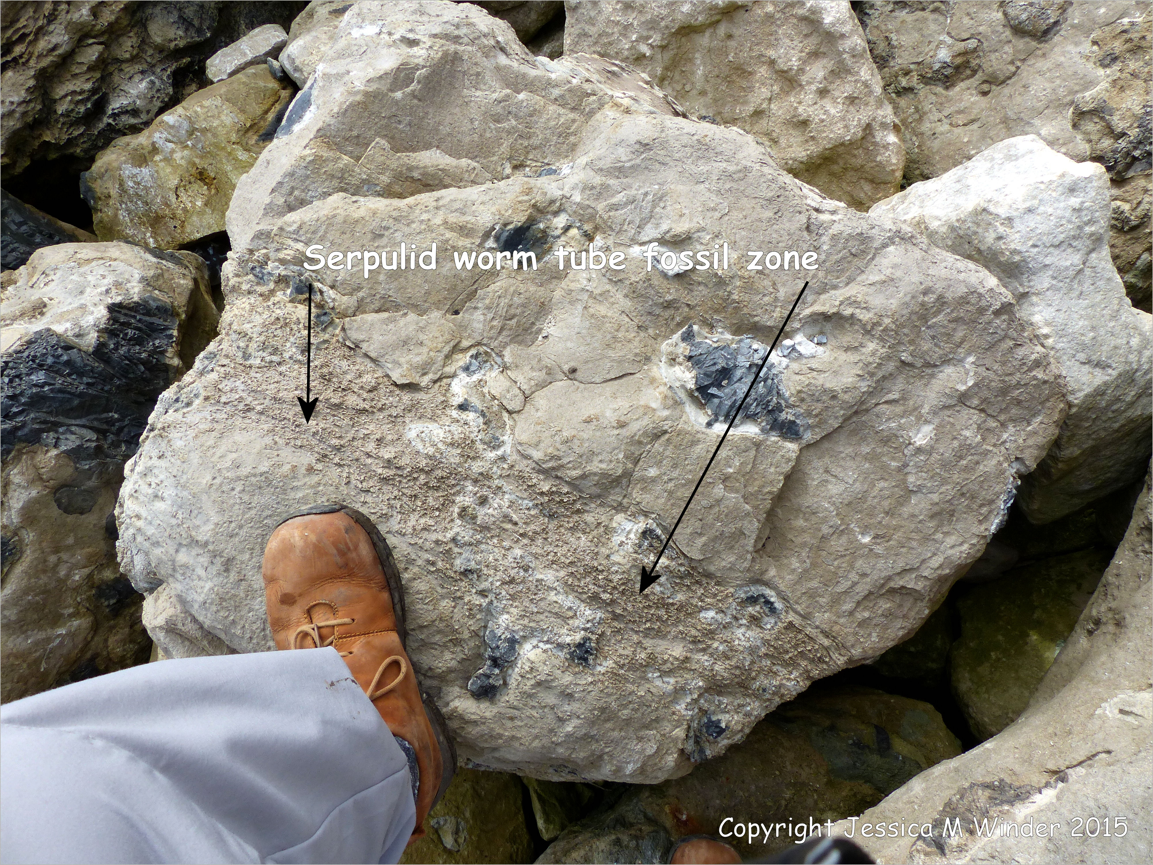 Winspit Serpulid Fossils 6 – Worm tube fossils, thought to be the serpulid worm Glomerula gordialis, in a boulder of Jurassic Portland Chert Member of the Portland Stone Formation, on the ledge at Winspit in Dorset, England.