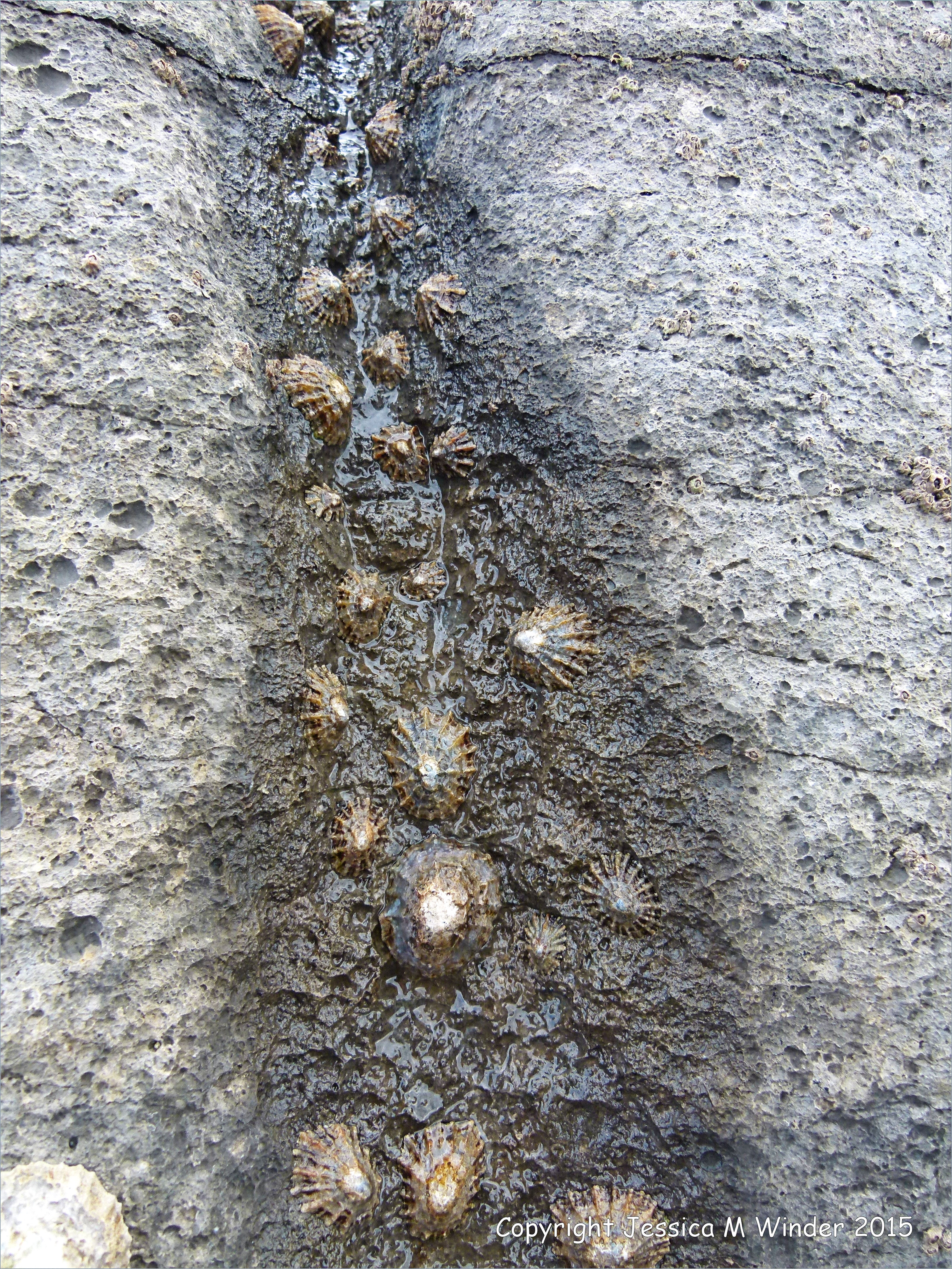 Doolin Rocks 18 – Limpets clustering on a wet patch of Carboniferous limestone furrow created by acid erosion on the upper shore at Doolin, County Clare, Ireland.