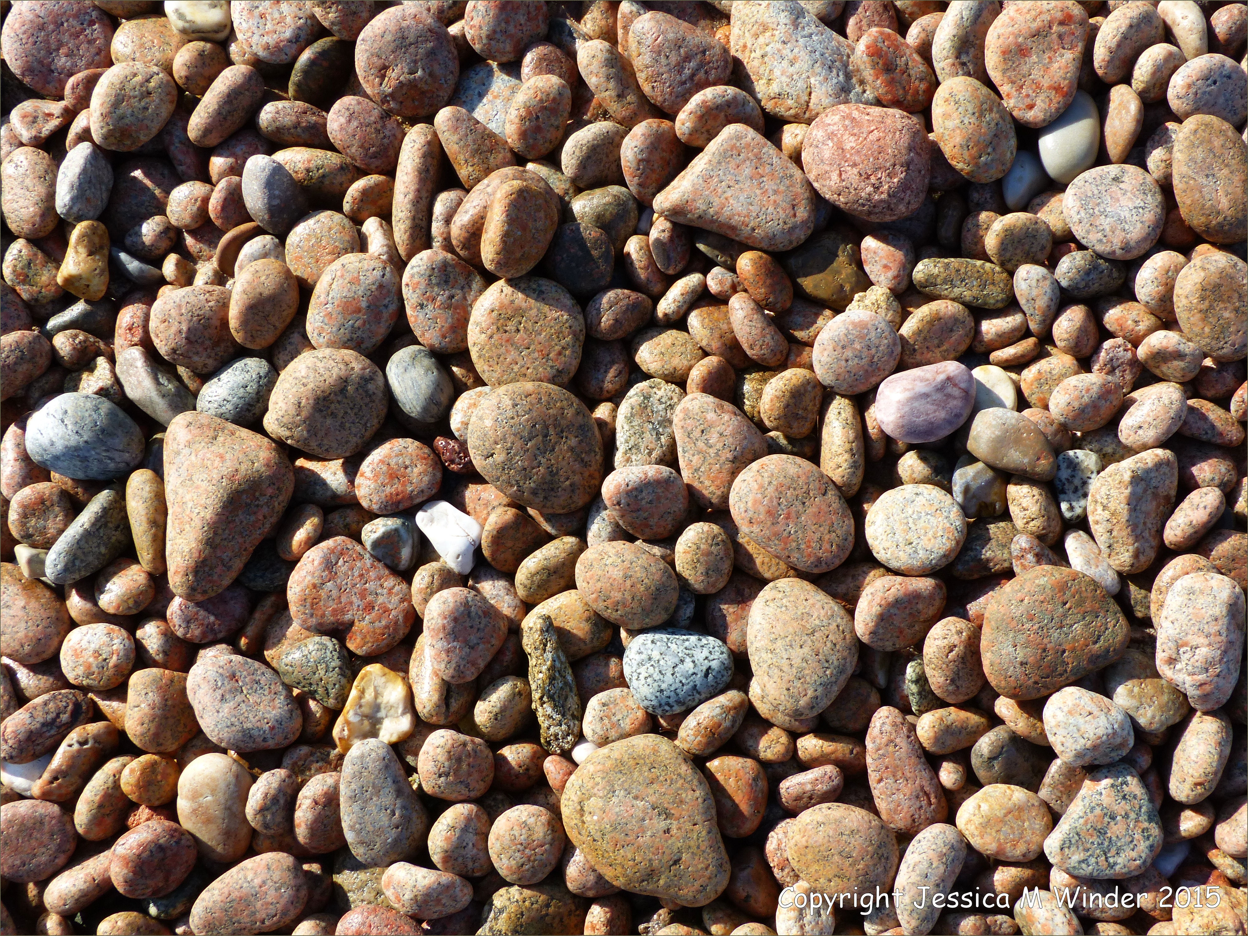 Pebbles at Albecq 5 – Colourful patterned pebbles of igneous rocks such as granites, diorites, and gabbros from the Northern Igneous Complex dating from 400 to 500 million years ago on the Channel Island of Guernsey. Photographed on the beach at Albecq on the north coast of the island.