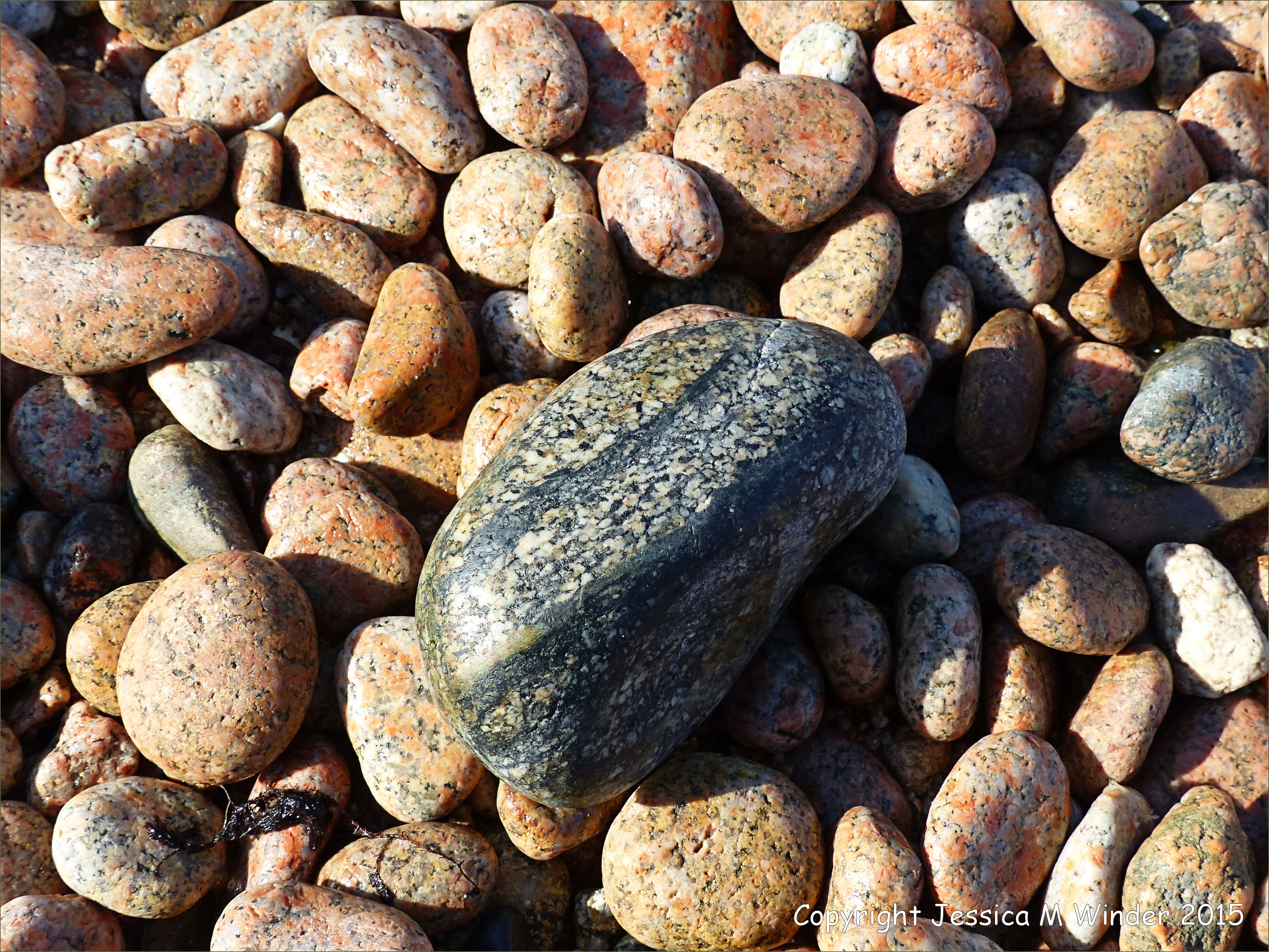 Pebbles at Albecq 8 – Colourful patterned pebbles of igneous rocks such as granites, diorites, and gabbros from the Northern Igneous Complex dating from 400 to 500 million years ago on the Channel Island of Guernsey. Photographed on the beach at Albecq on the north coast of the island.