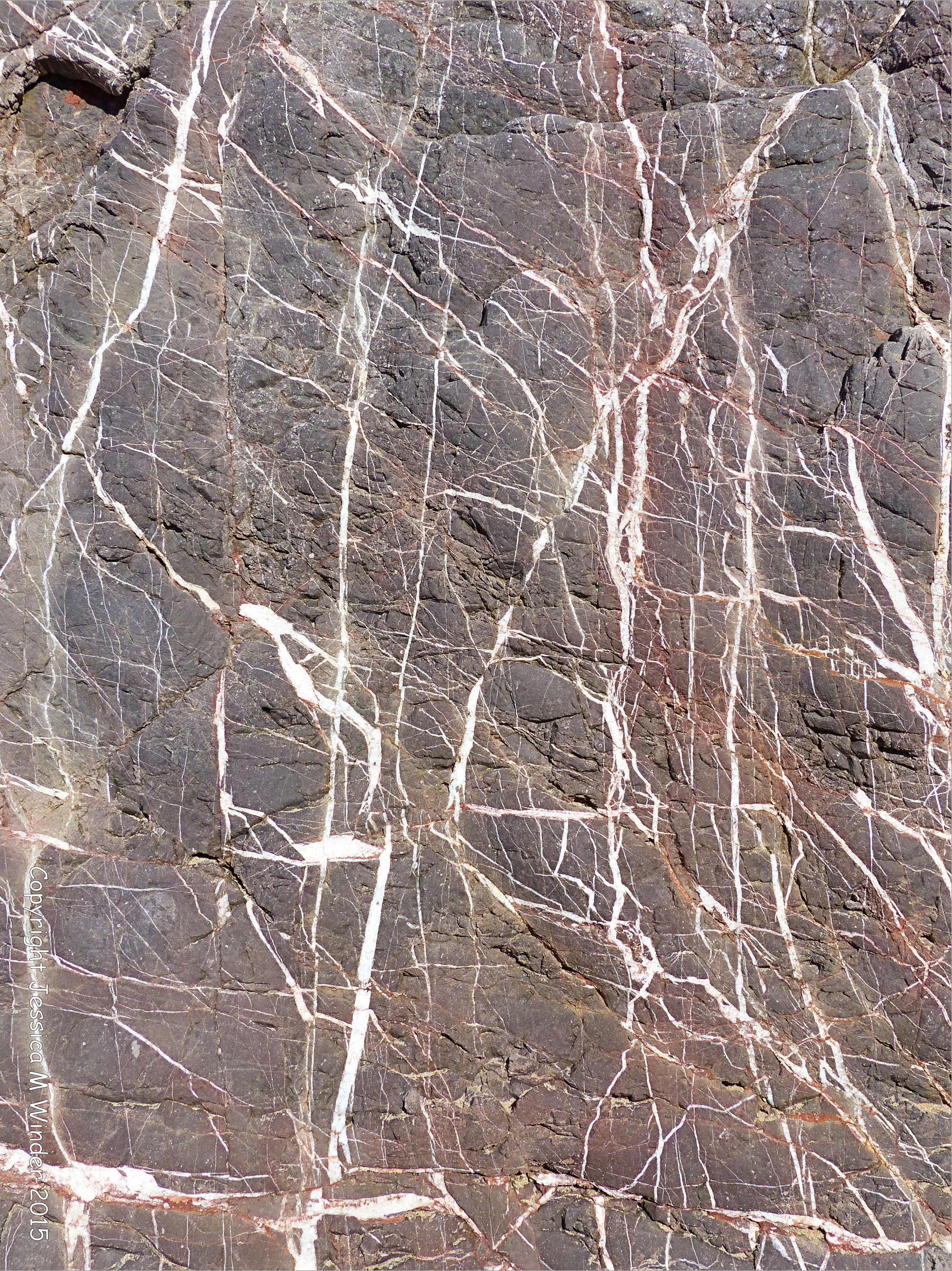 ThreeCliff Calcite Veins 7 – Close-up of the east cliff at Threecliff Bay in Gower, South Wales, made of carboniferous limestone tinted red by iron compounds and bearing calcite veins, possibly resulting from the tear faulting down the Pennard Pill valley.