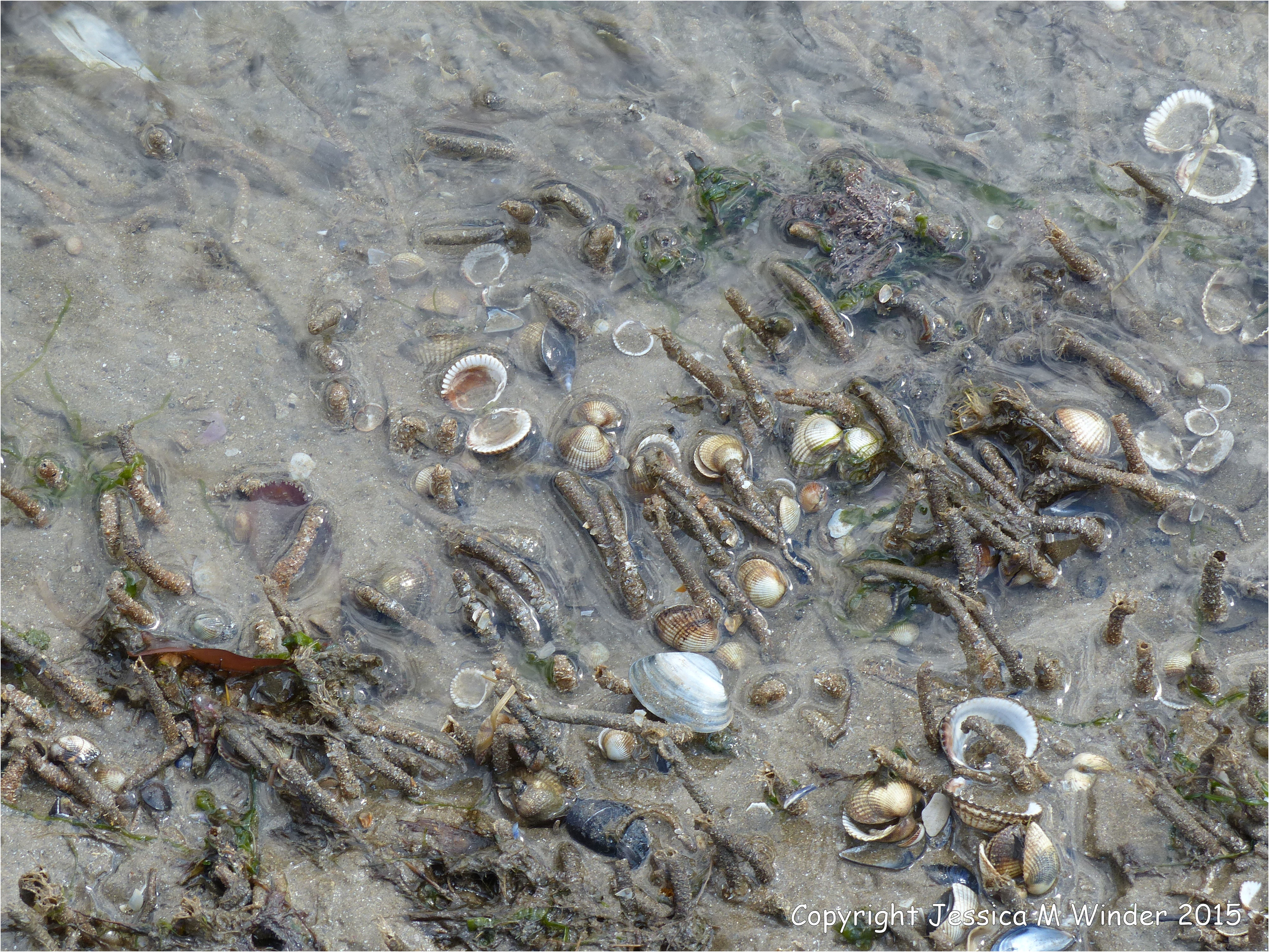 Traces on Whiteford Beach 6 – Sandgrain tubes of marine worms projecting from the sediments with seashells on the edge of a beach stream at Whiteford Sands, Gower, South Wales, August 2015.