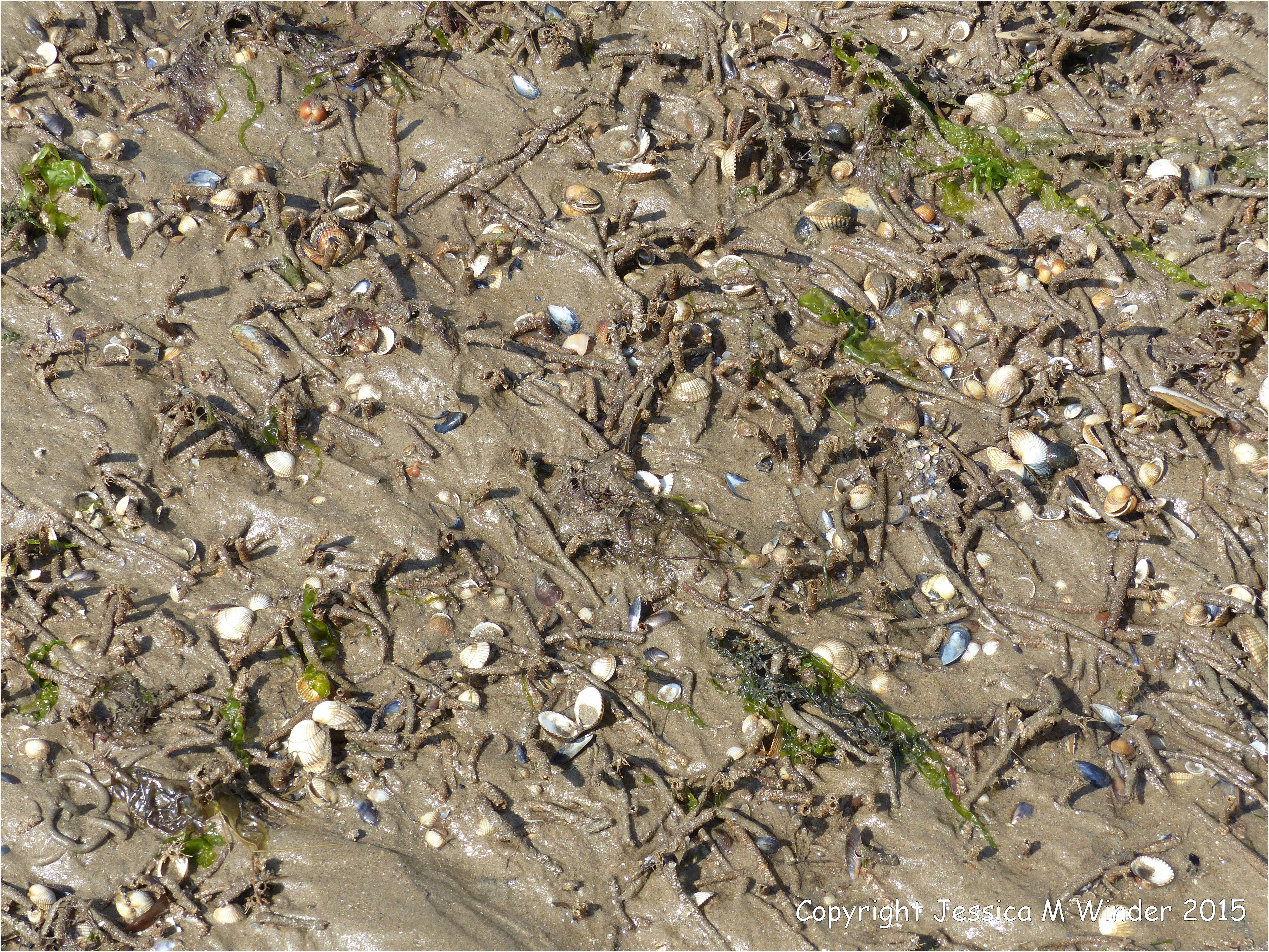 Traces on Whiteford Beach 4 – Sandgrain tubes of marine worms projecting from the sediments with seashells at Whiteford Sands, Gower, South Wales, August 2015.