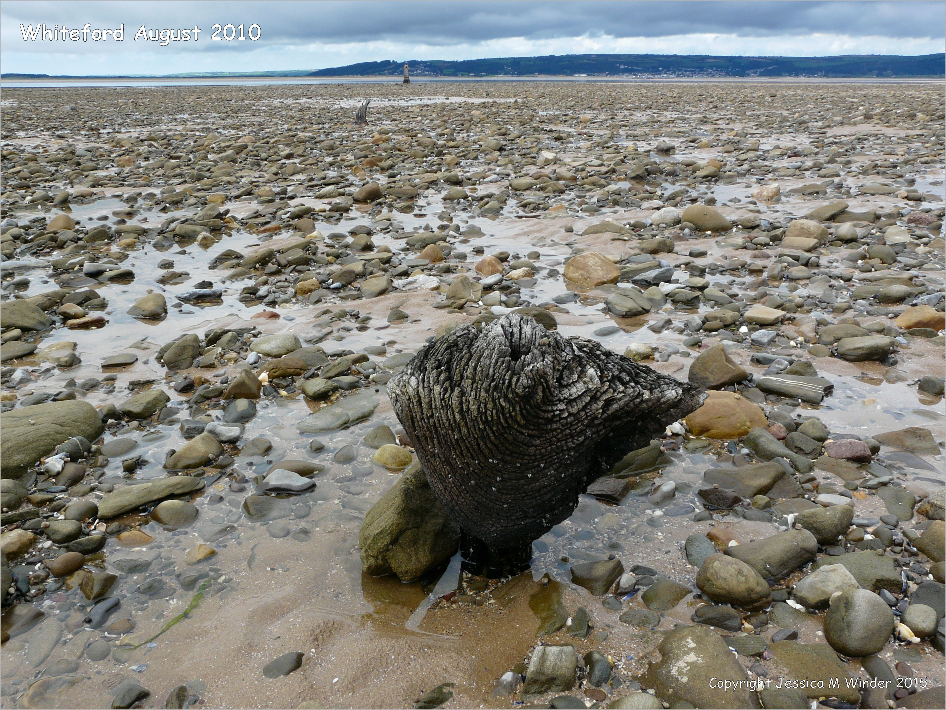 016 Whiteford 2010 August – View looking towards the lighthouse at Whiteford on the Gower Peninsula showing rock strewn beach with patches of sand.
