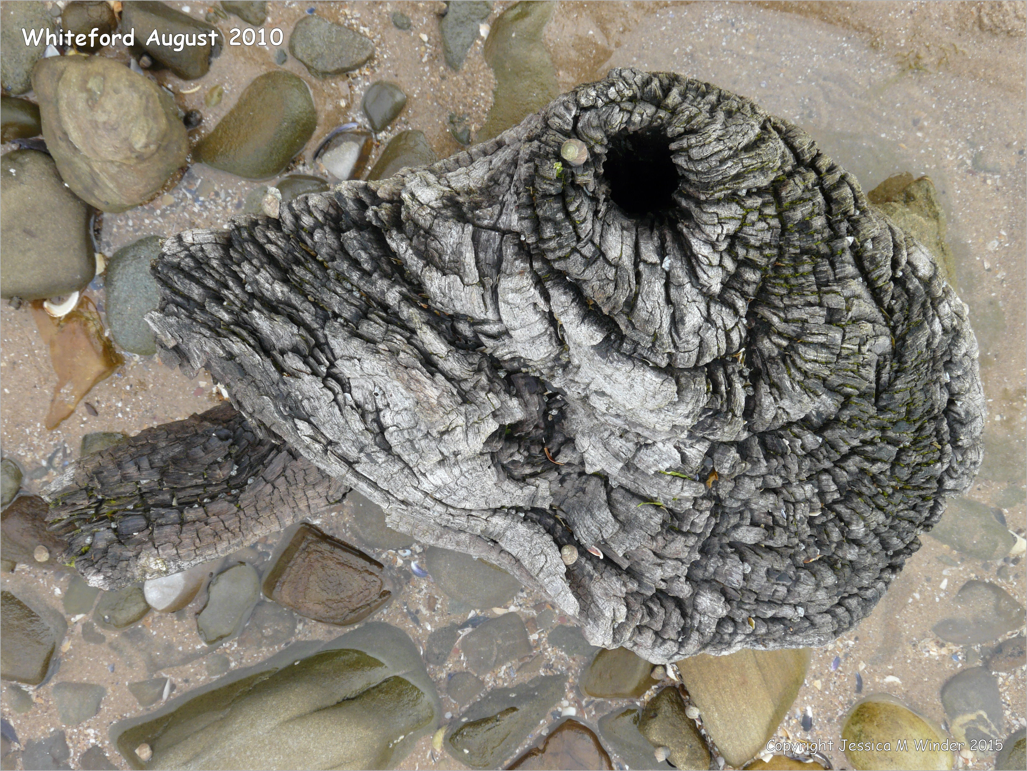 018 Whiteford 2010 August – Odd shaped piece of ancient wood protruding from a stone covered beach at Whiteford on the Gower Peninsula in South Wales.