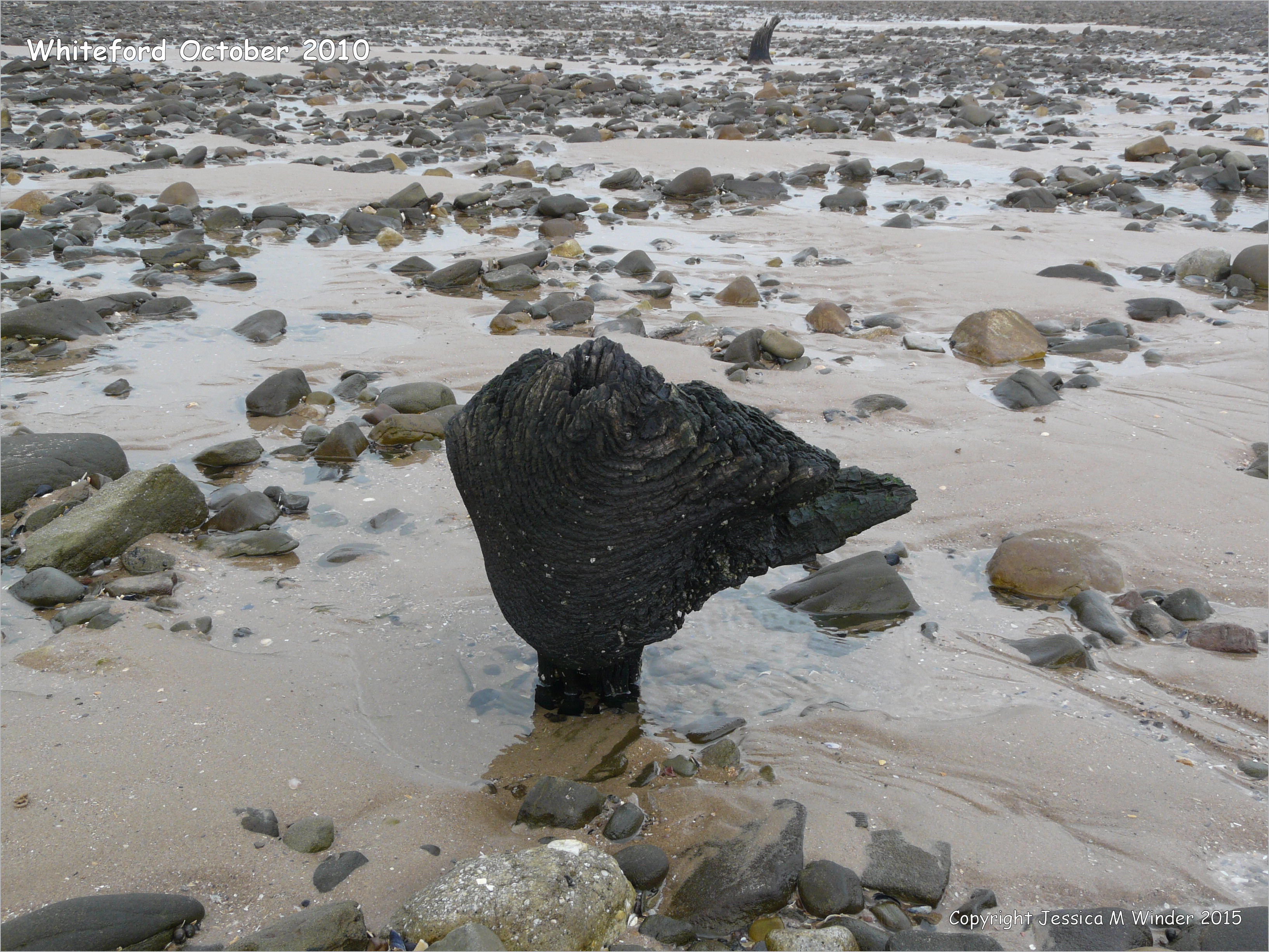 019 Whiteford 2010 October – Odd shaped piece of ancient wood protruding from a partially sand covered stoney beach at Whiteford on the Gower Peninsula