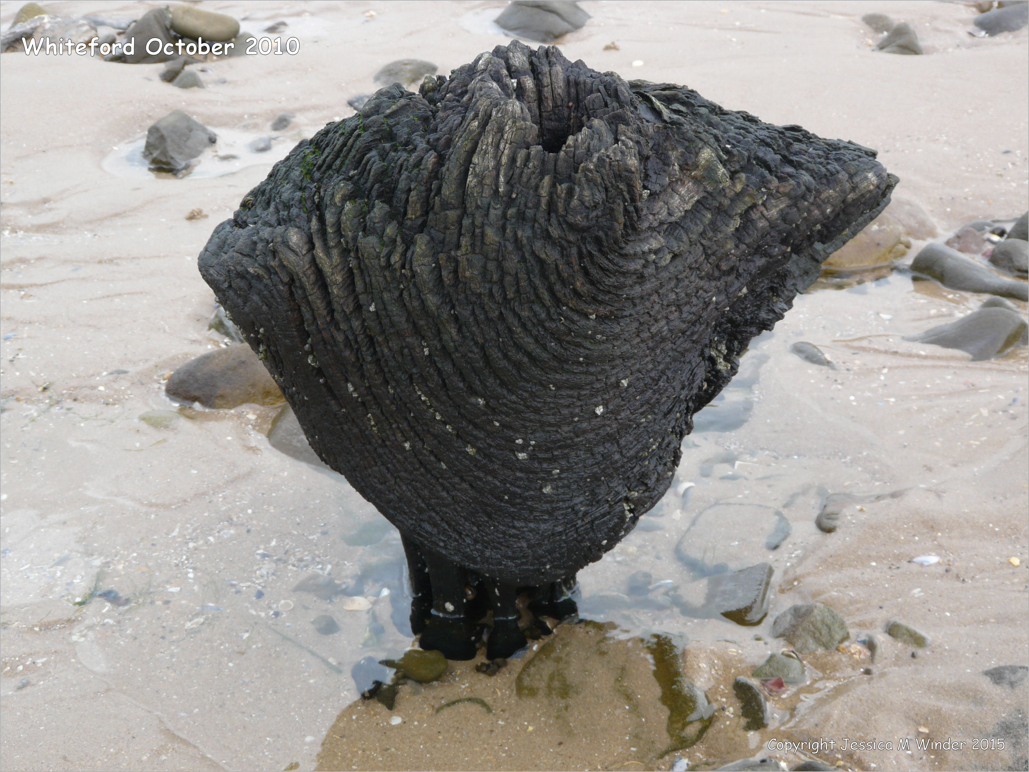 020 Whiteford 2010 October – Odd shaped piece of ancient wood protruding from a partially sand covered beach at Whiteford on the Gower Peninsula in South Wales.