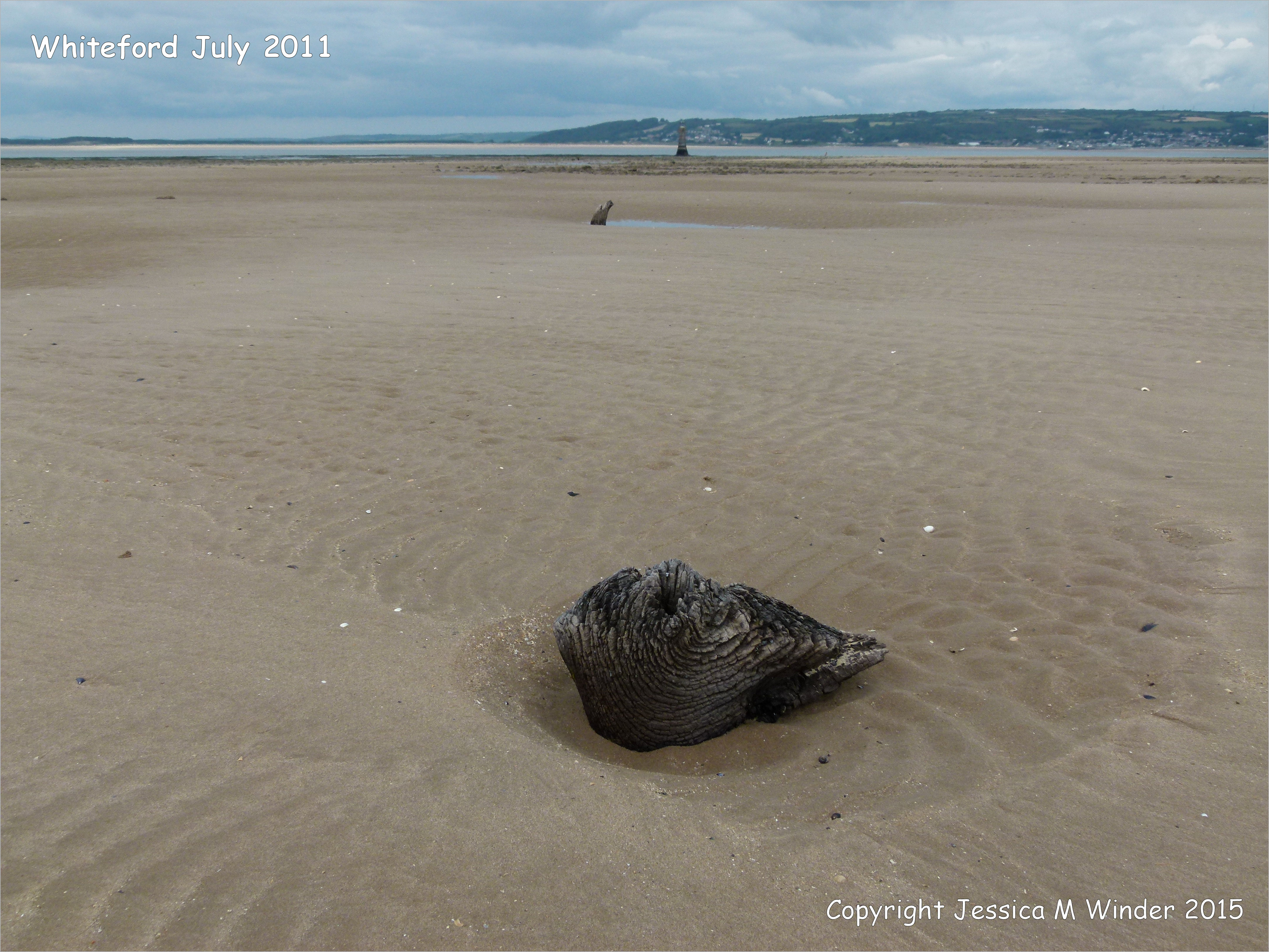021 Whiteford 2011 July – View looking towards the lighthouse at Whiteford on the Gower Peninsula showing the entire area covered by sand but with a few pieces of old wood remaining above the sand.