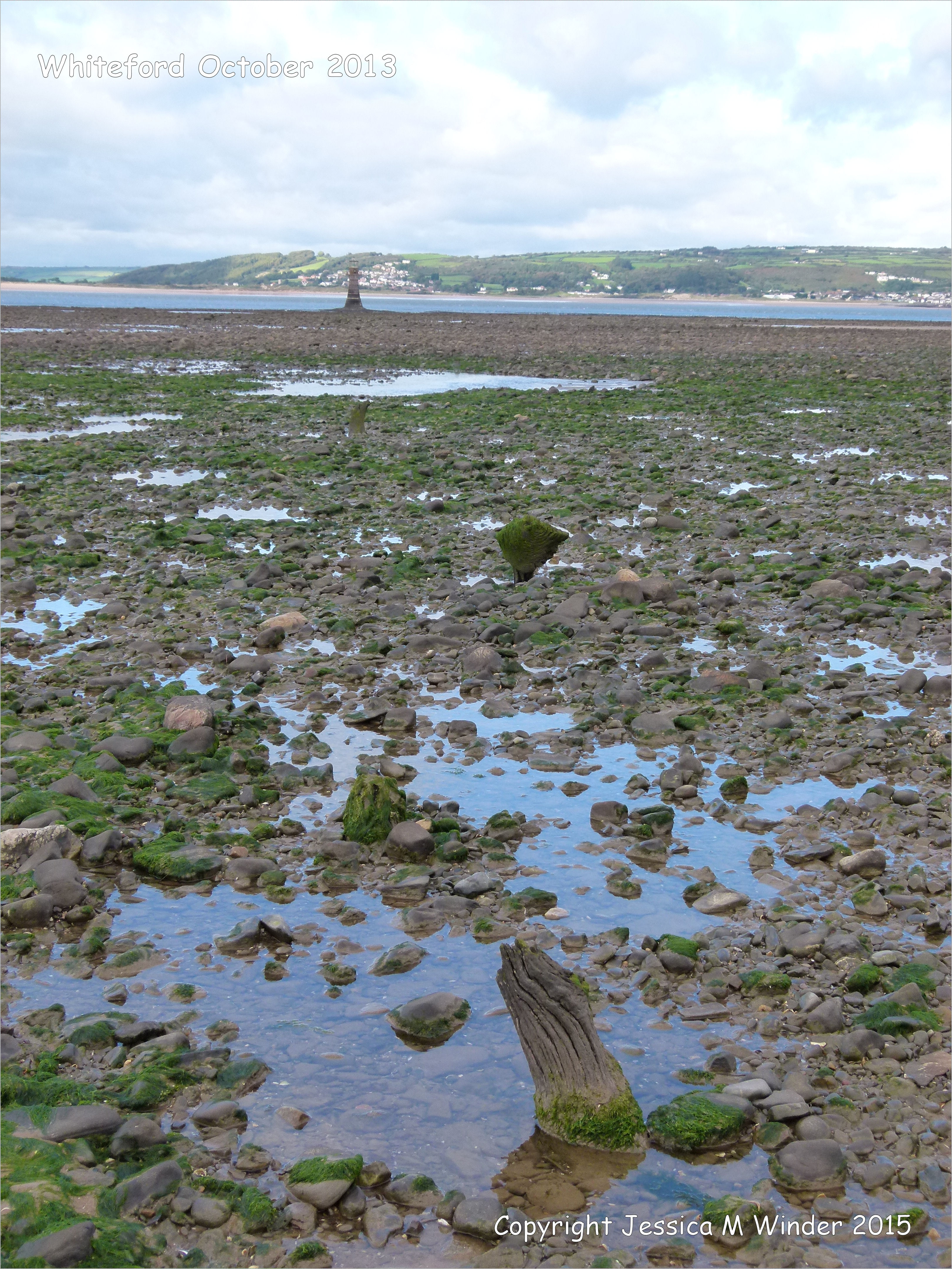 033 Whiteford 2013 October – View looking towards the lighthouse at Whiteford on the Gower Peninsula showing rock strewn beach
