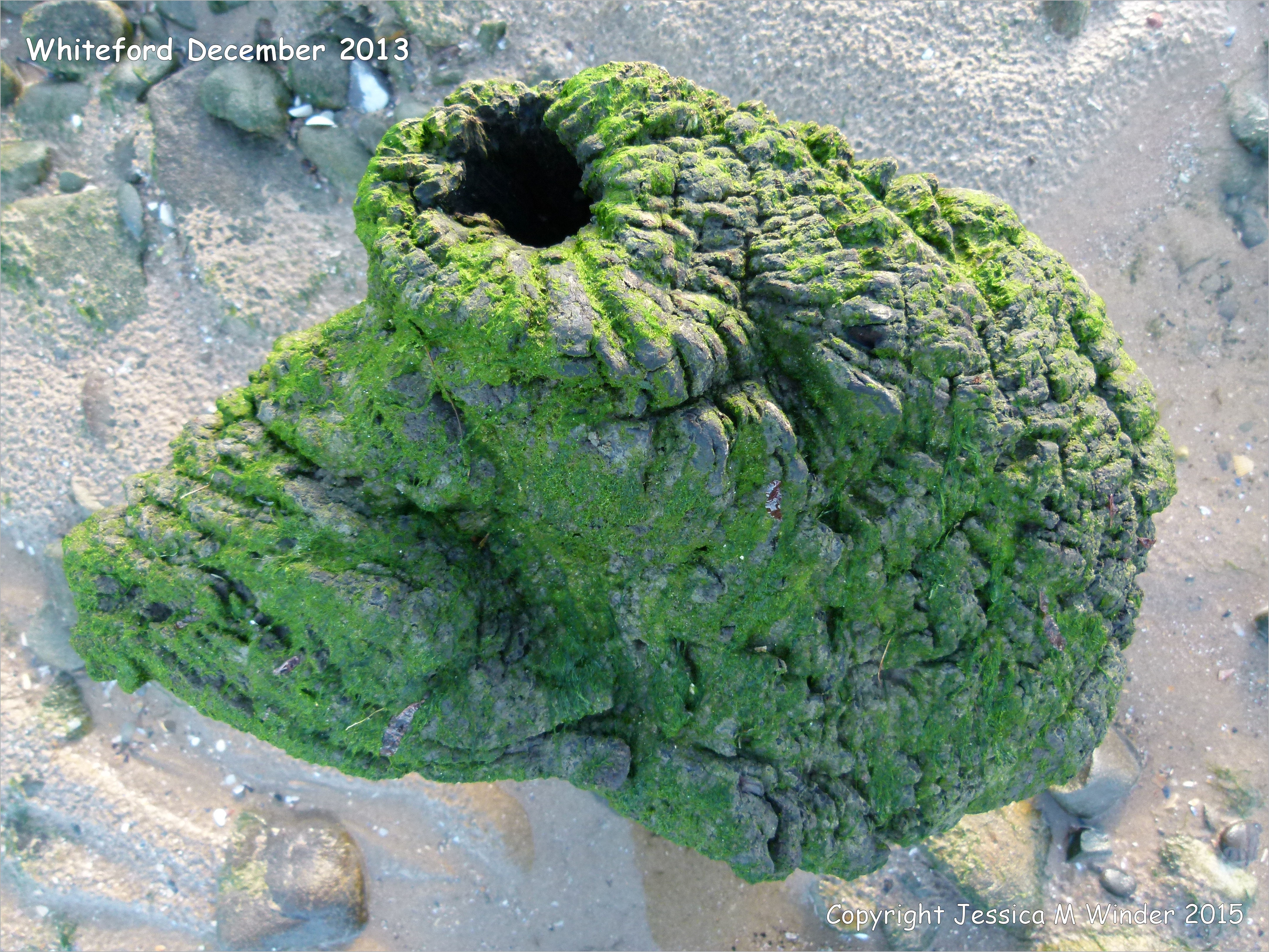 037 Whiteford 2013 December – Odd shaped piece of ancient wood covered with green algae and protruding from a stone covered beach at Whiteford on the Gower Peninsula in South Wales.