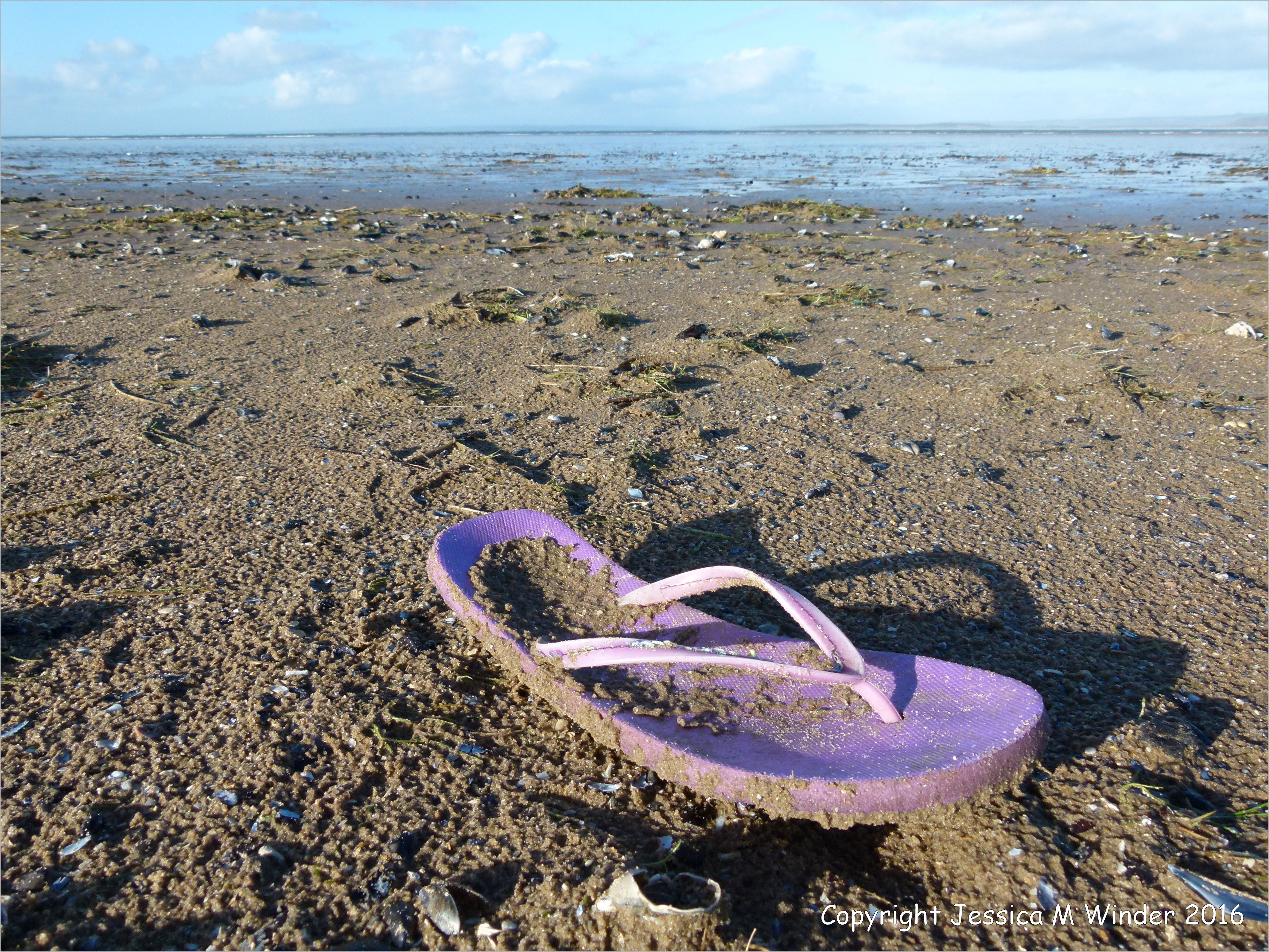 Winter Walk at Whiteford 2 – Flotsam purple flip-flop shoe on the strandline at Whiteford Sands, Gower, South Wales, 26 December 2013.