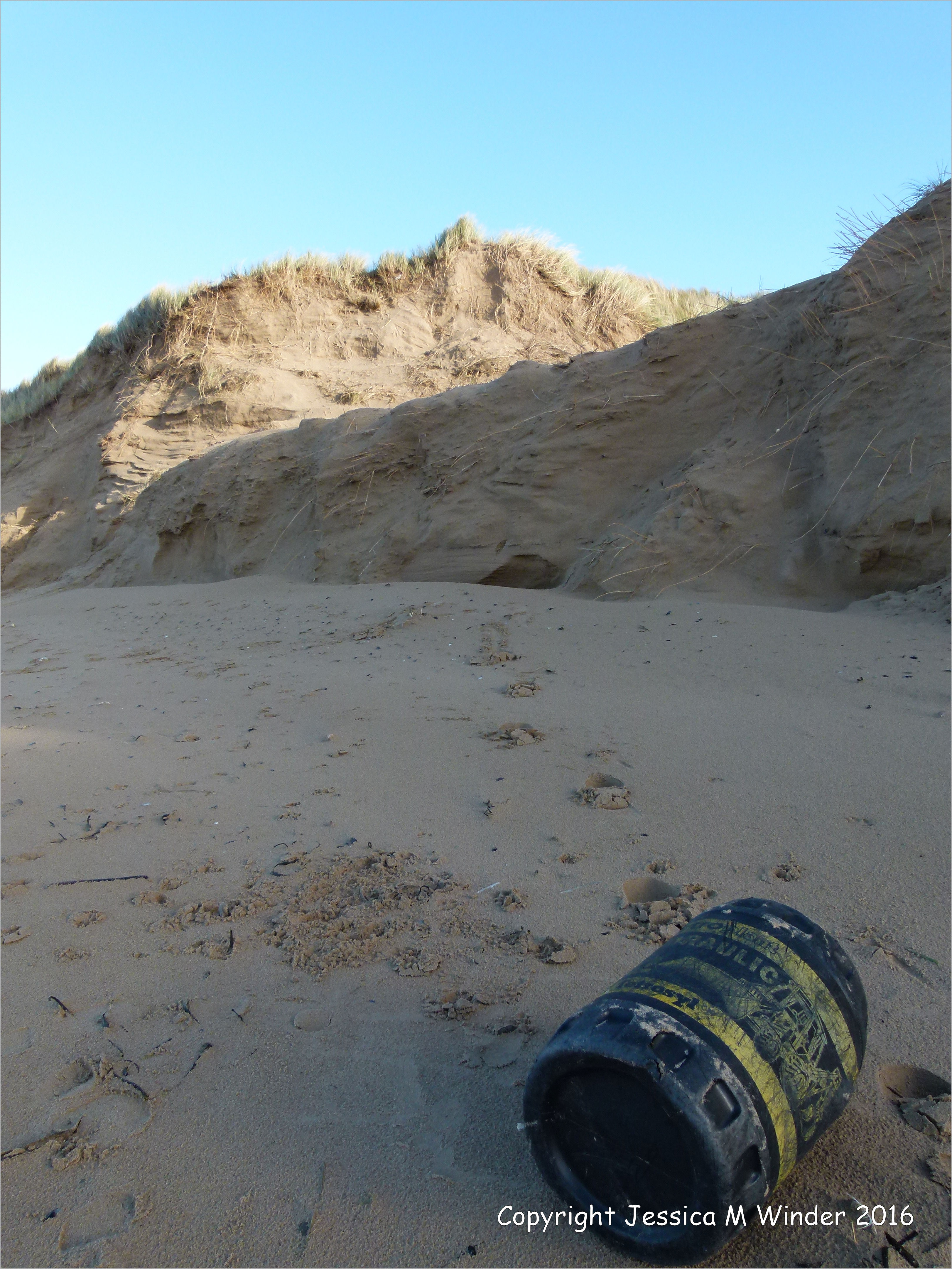 Winter Walk at Whiteford 10 – Black plastic oil drum washed ashore at Whiteford Sands, Gower, South Wales, 26 December 2013.