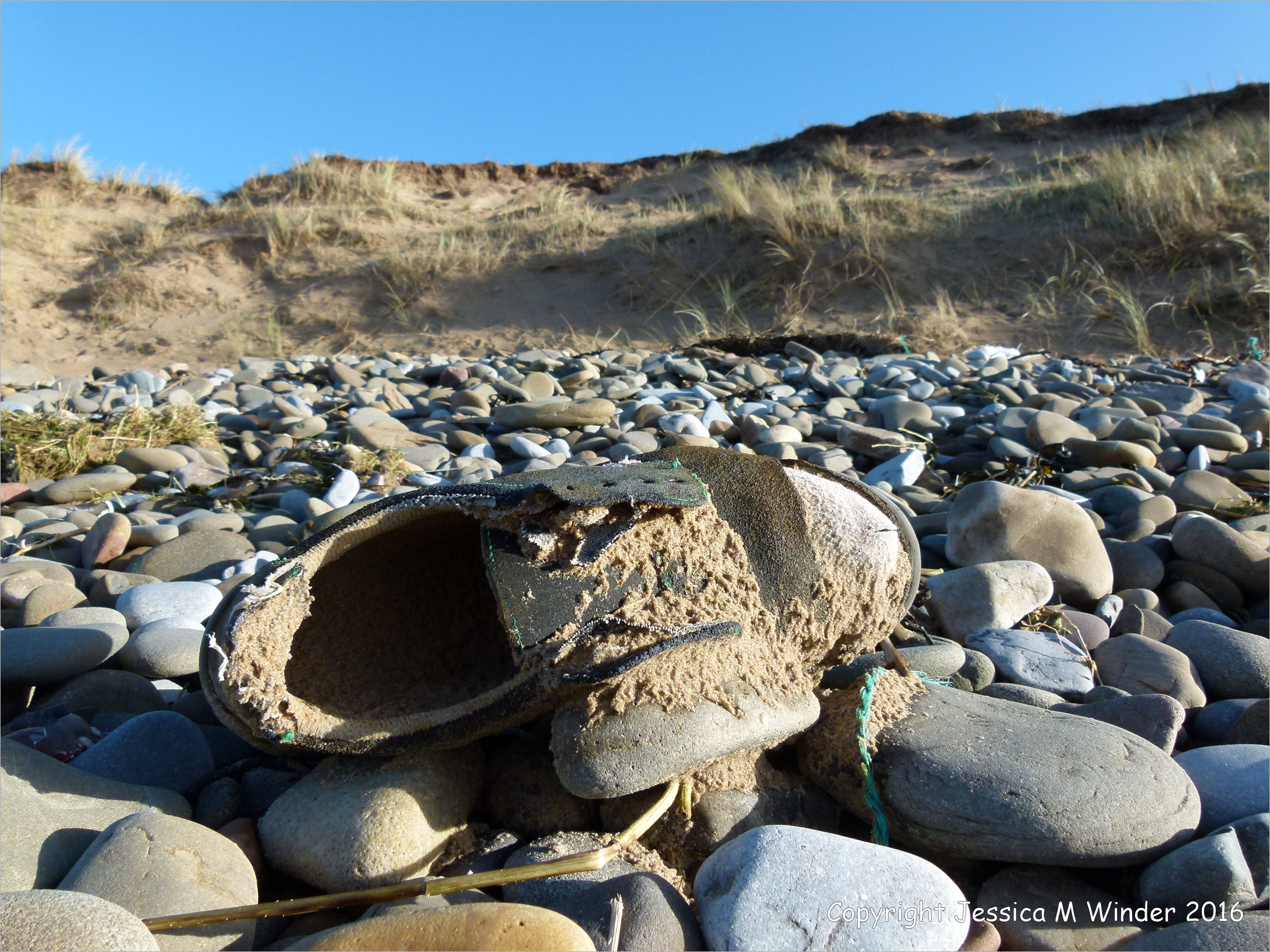 Winter Walk at Whiteford 19 – Flotsam shoe washed ashore on pebbles at Whiteford Sands, Gower, South Wales, 26 December 2013.