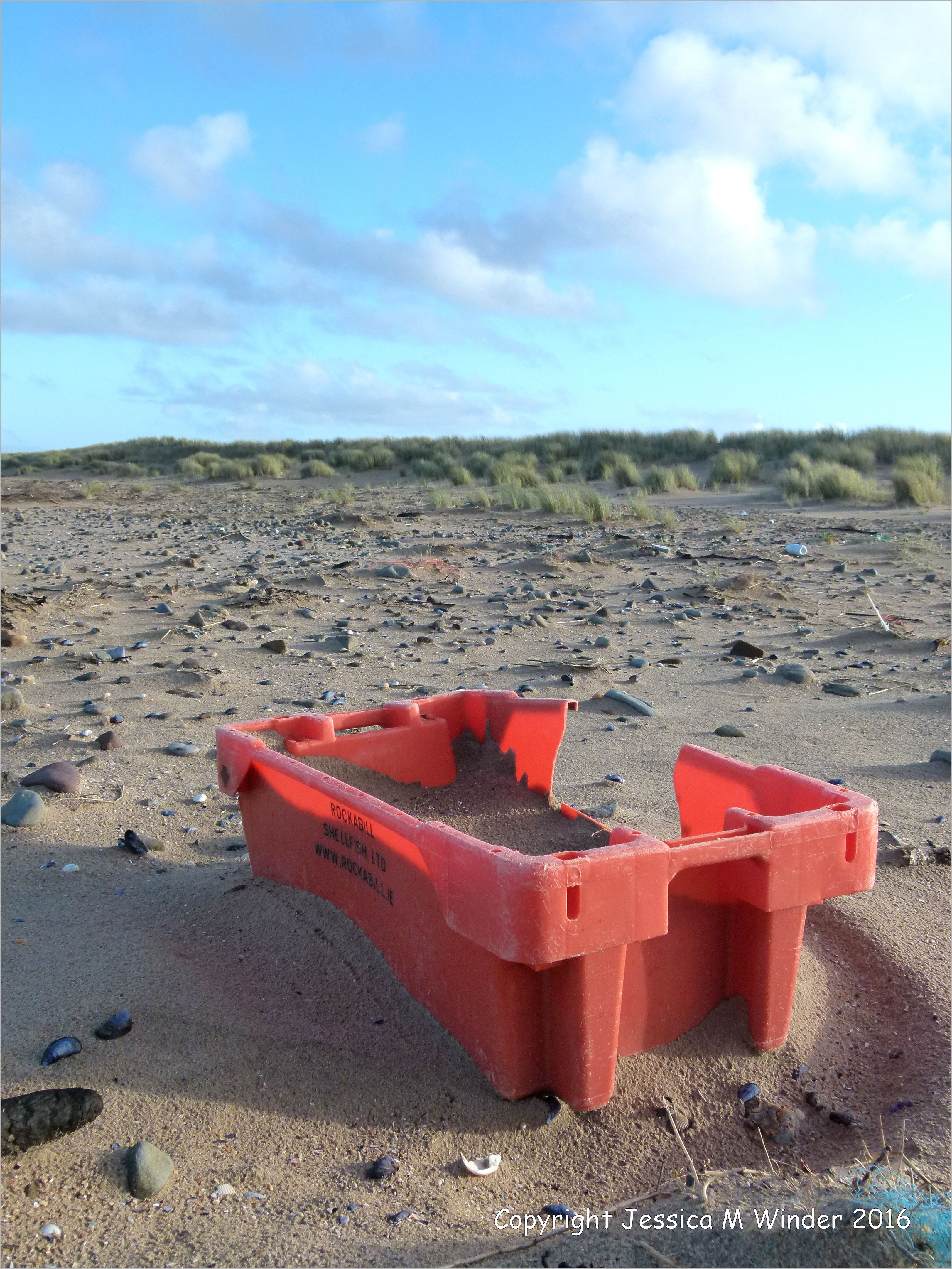 Winter Walk at Whiteford 31 – Red plastic flotsam fishing crate washed ashore at Whiteford Sands, Gower, South Wales, 26 December 2013.