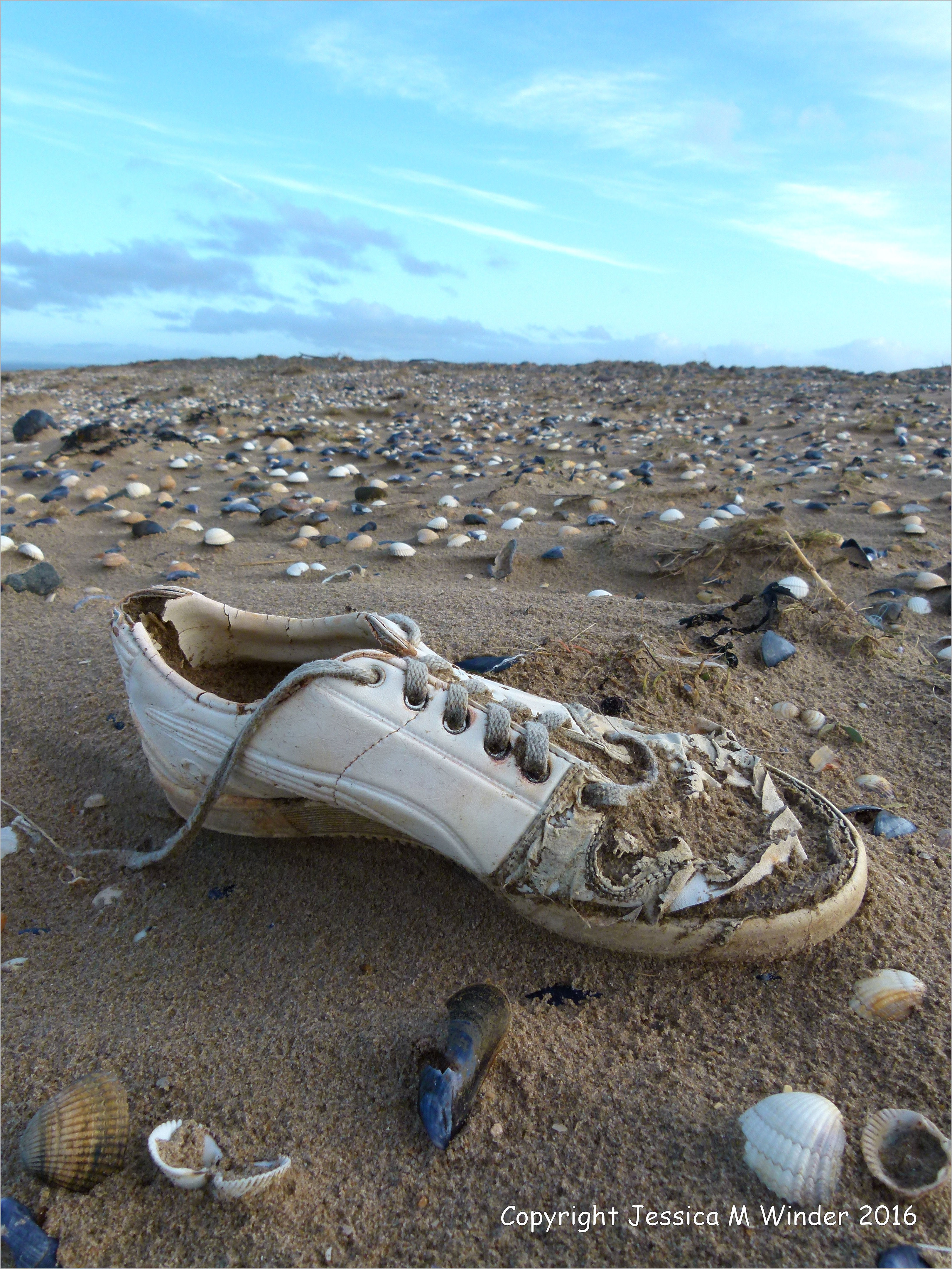 Winter Walk at Whiteford 35 – Flotsam white trainer shoe washed ashore at Whiteford Sands, Gower, South Wales, 26 December 2013.