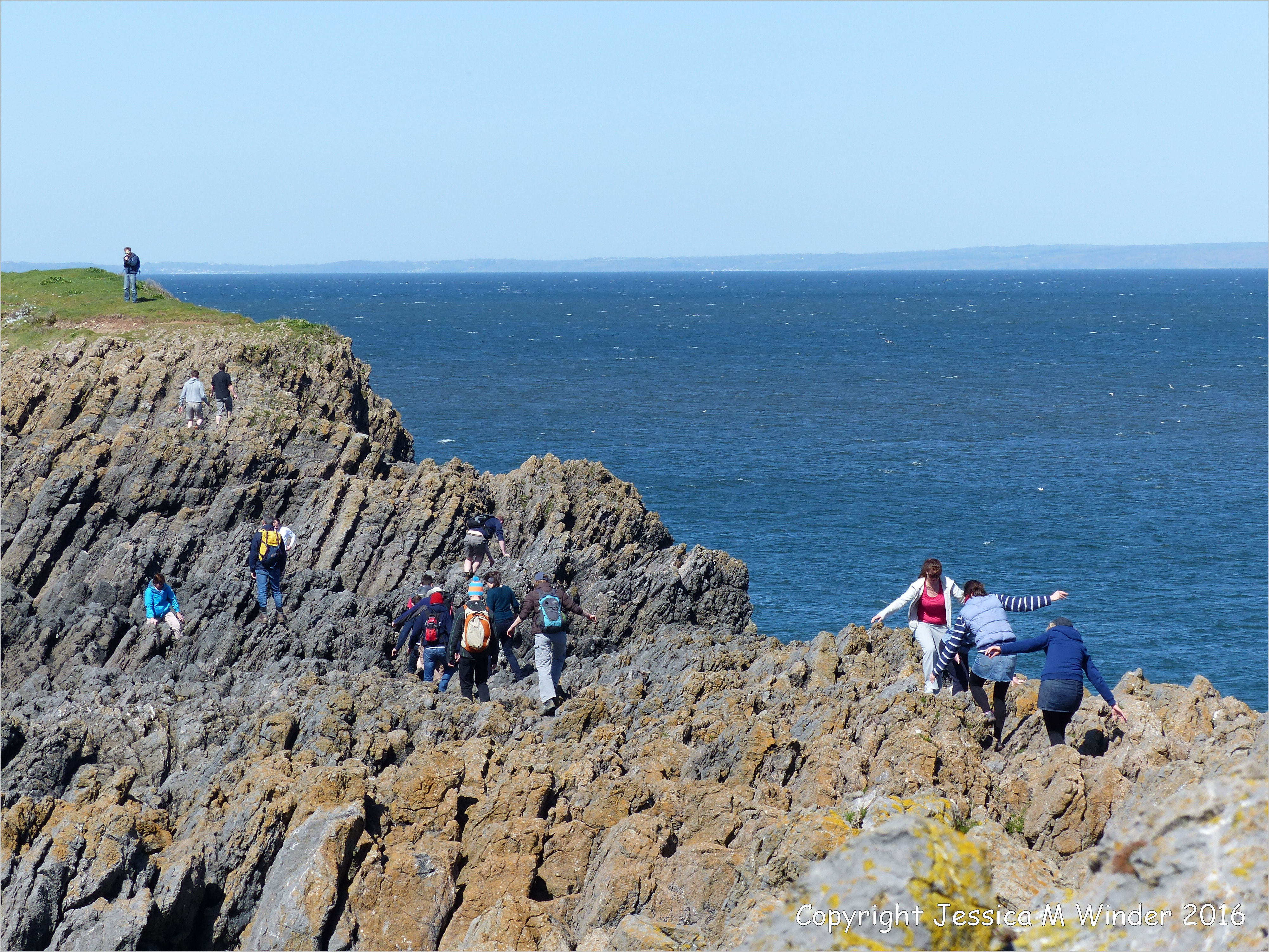 Worms Head West 43 – People clambering over the steeply inclined sharp rock strata of the Low Neck connecting Inner and Middle Head on Worm’s Head Island, Gower, South Wales.