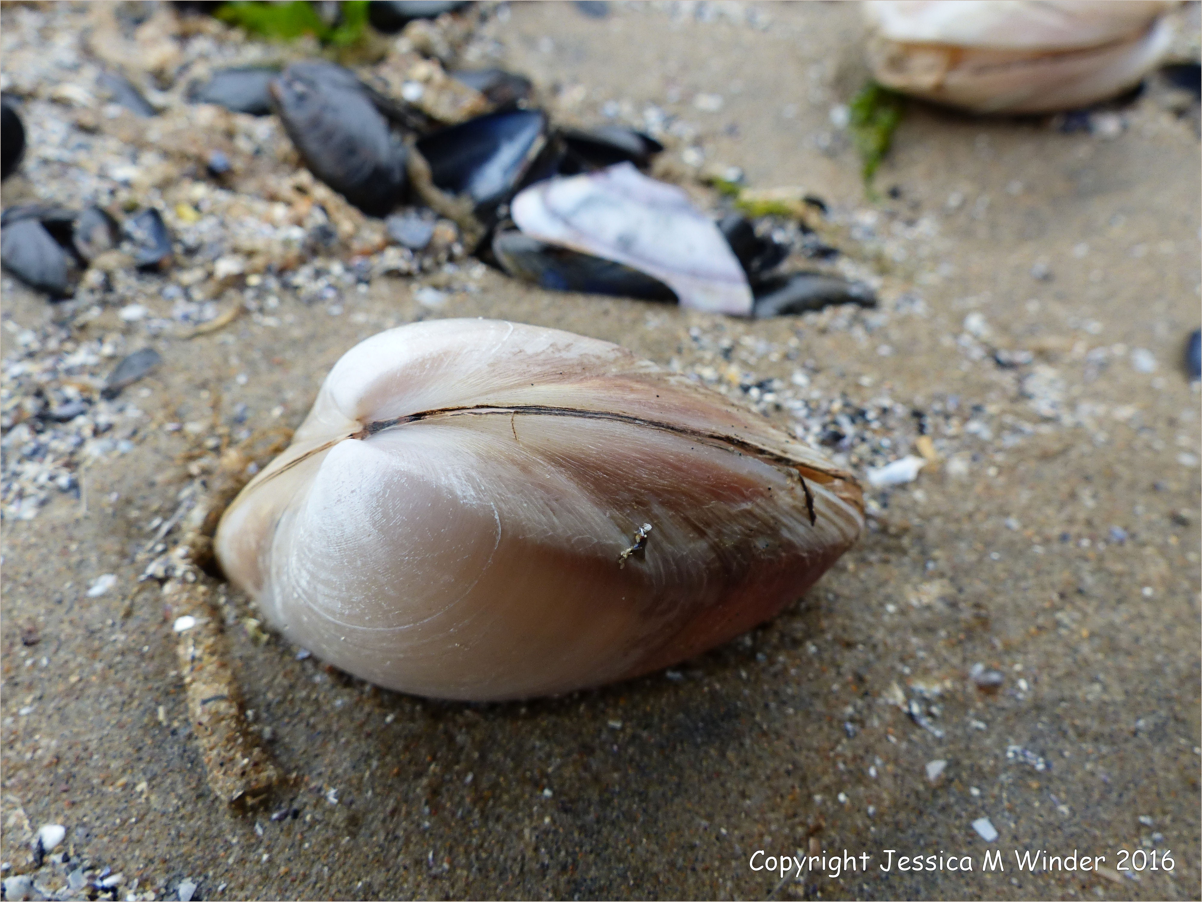 More Rhossili Rayed Trough Shells 7 – Live Rayed Trough Shell (Mactra stultorum Linnaeus) emerging from its shallow sandy burrow at low tide on the beach at Rhossili, Gower, South Wales, August 2015.