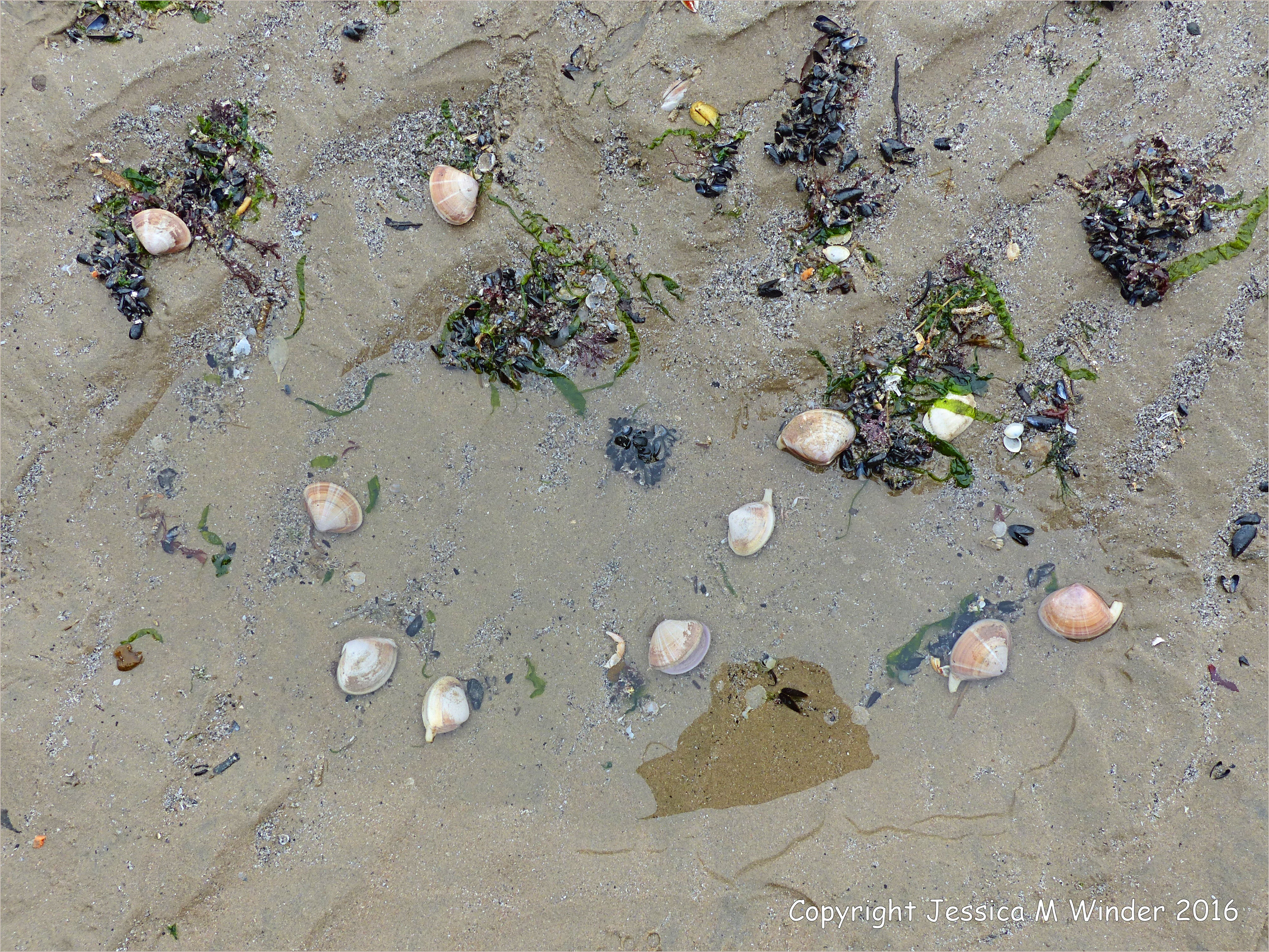 More Rhossili Rayed Trough Shells 12 – Living Rayed Trough Shells (Mactra stultorum Linnaeus) with protruding siphons in a shallow tide pool on a sandy beach at low tide at Rhossili, Gower, South Wales, August 2015.
