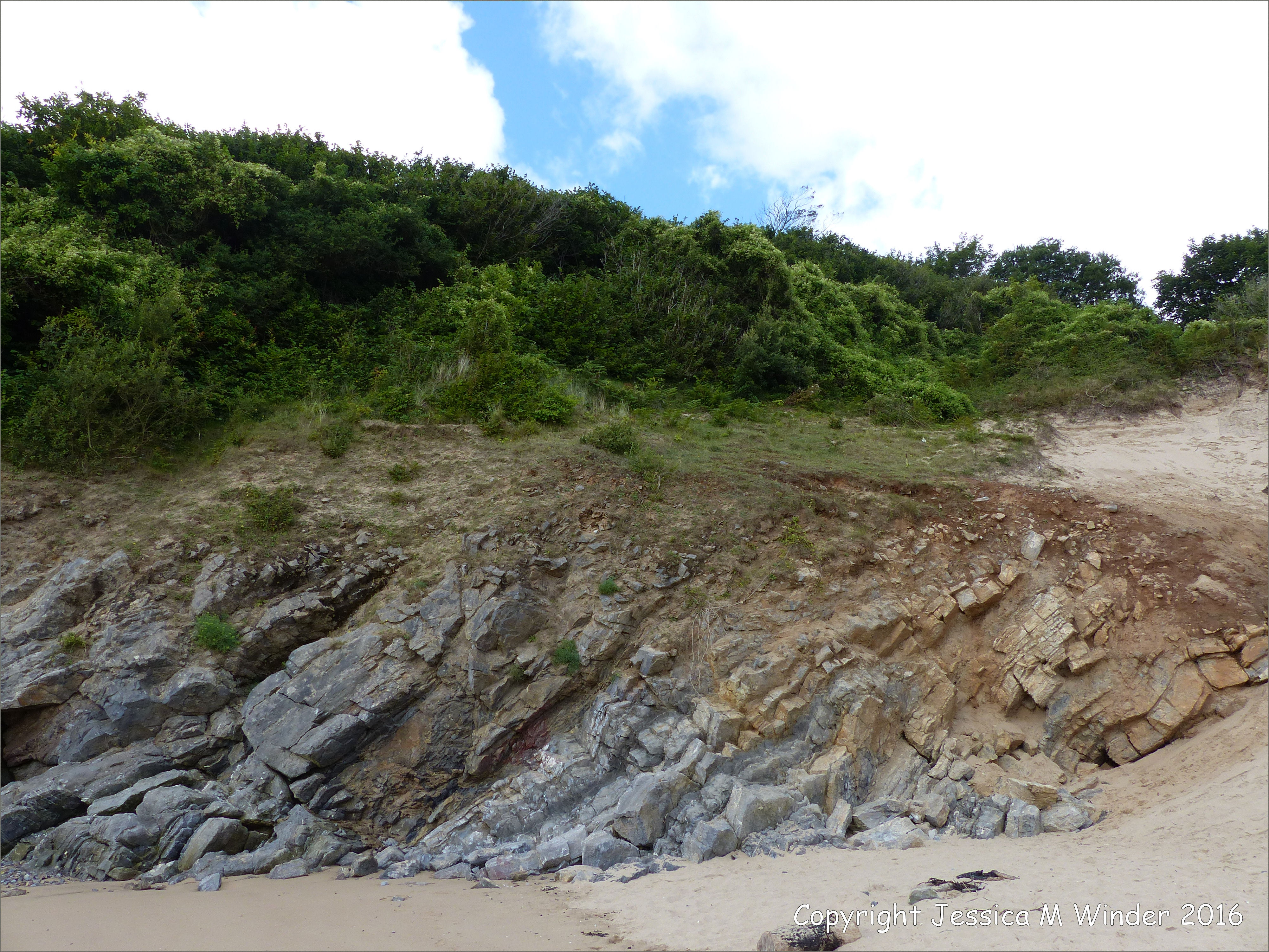Three Cliffs Rocks WCN 17 – Limestone on the west side (north) of Three Cliffs Bay (context shot) showing Carboniferous Pembroke Group Limestone, Black Rock Limestone Subgroup, in cliffs on the west side of Three Cliffs Bay, Gower, South Wales.