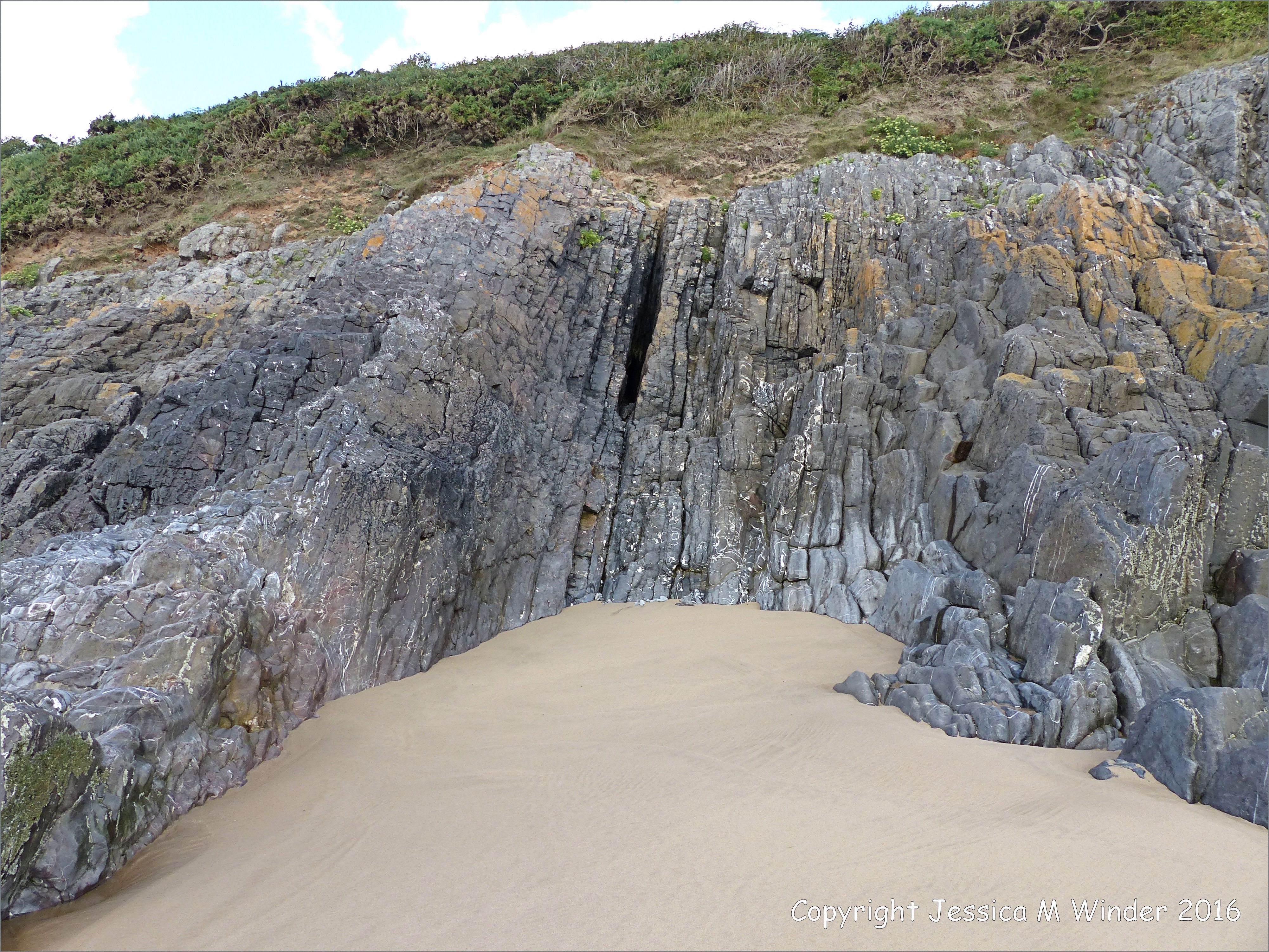 Three Cliffs Rocks WCN 22 – Cliff strata of Carboniferous Pembroke Group Limestone, Black Rock Limestone Subgroup, in cliffs on the west side of Three Cliffs Bay, Gower, South Wales.