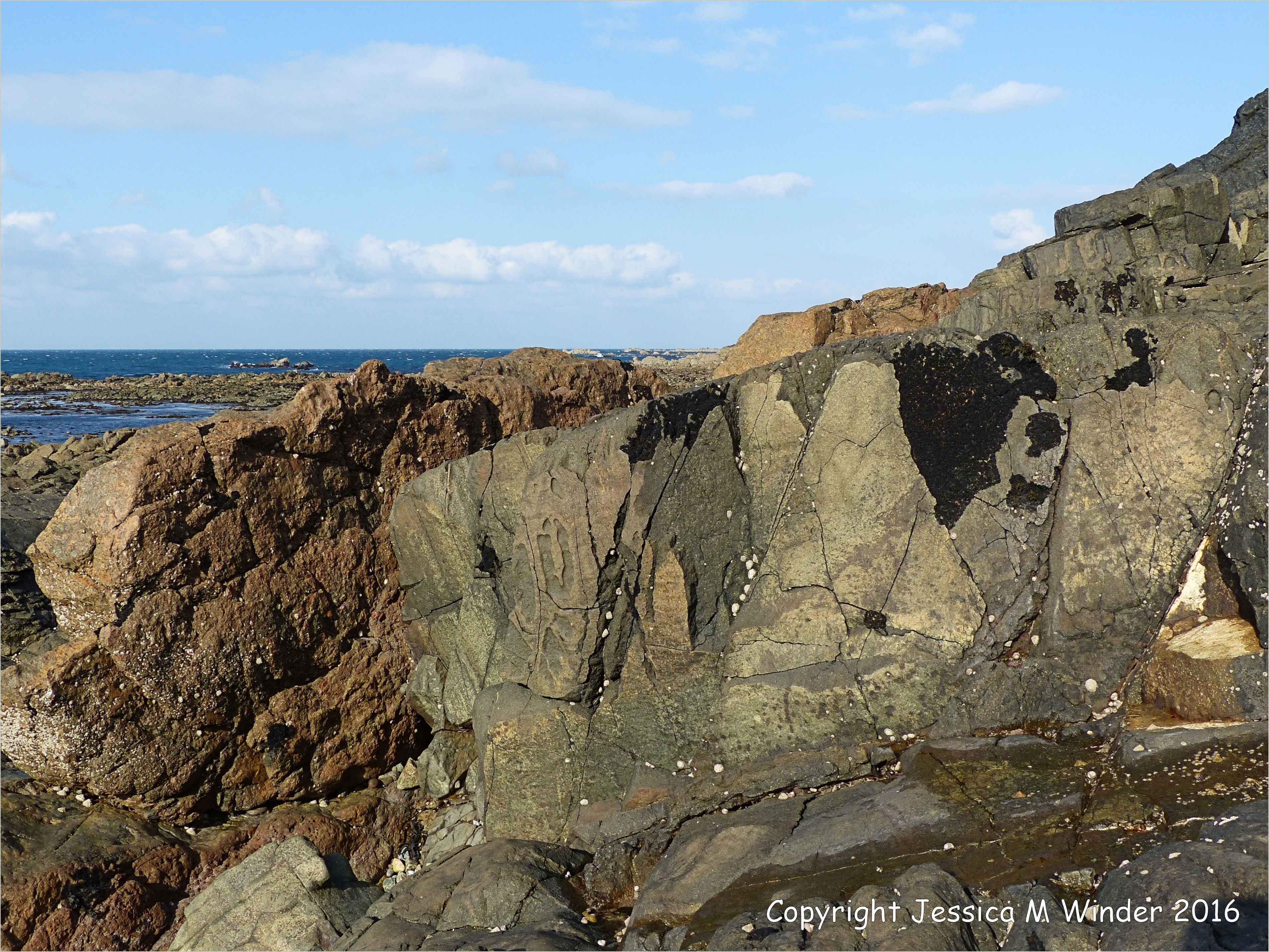 Albite Dolerite Dyke L’Eree 5 – An albite dolerite dyke with horizontal columnar jointing like steps, and strange weathering texture, crossing the L’Eree granite on the beach near Lihou island, in Guernsey, the Channel Islands.