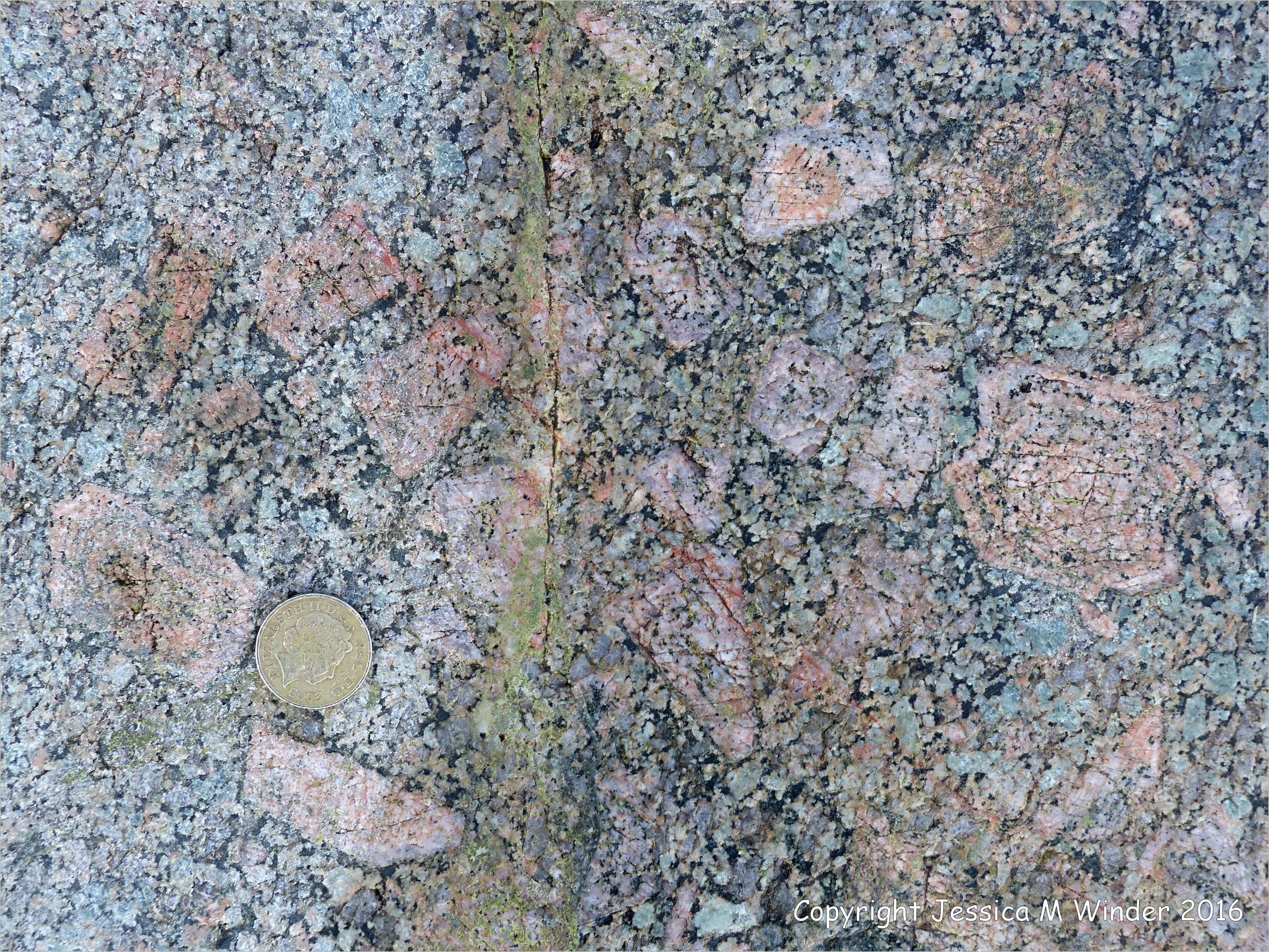 L’Eree Granite 7 – Macro photograph of a rock outcrop of L’Eree Granite showing crystal composition with large pink megacrysts of feldspar on the Channel Island of Guernsey, taken on the shore between the L’Eree Headland and Lihou Island. One pound coin included to give scale.
