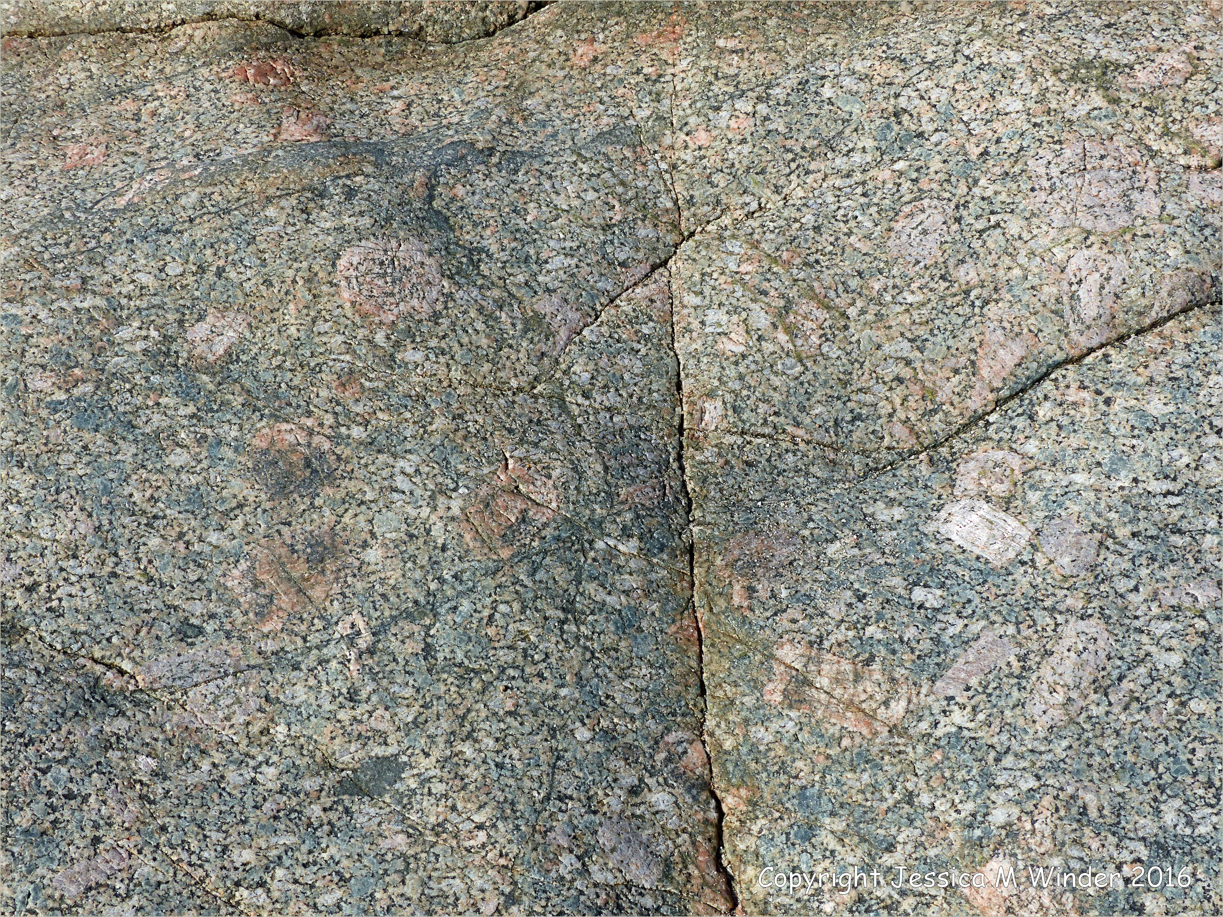 L’Eree Granite 13 – Rock outcrop of L’Eree Granite on the Channel Island of Guernsey, photographed on the shore between the L’Eree Headland and Lihou Island. Showing darker area thought to be the ‘ghost’ of a Bordeaux diorite xenolith.