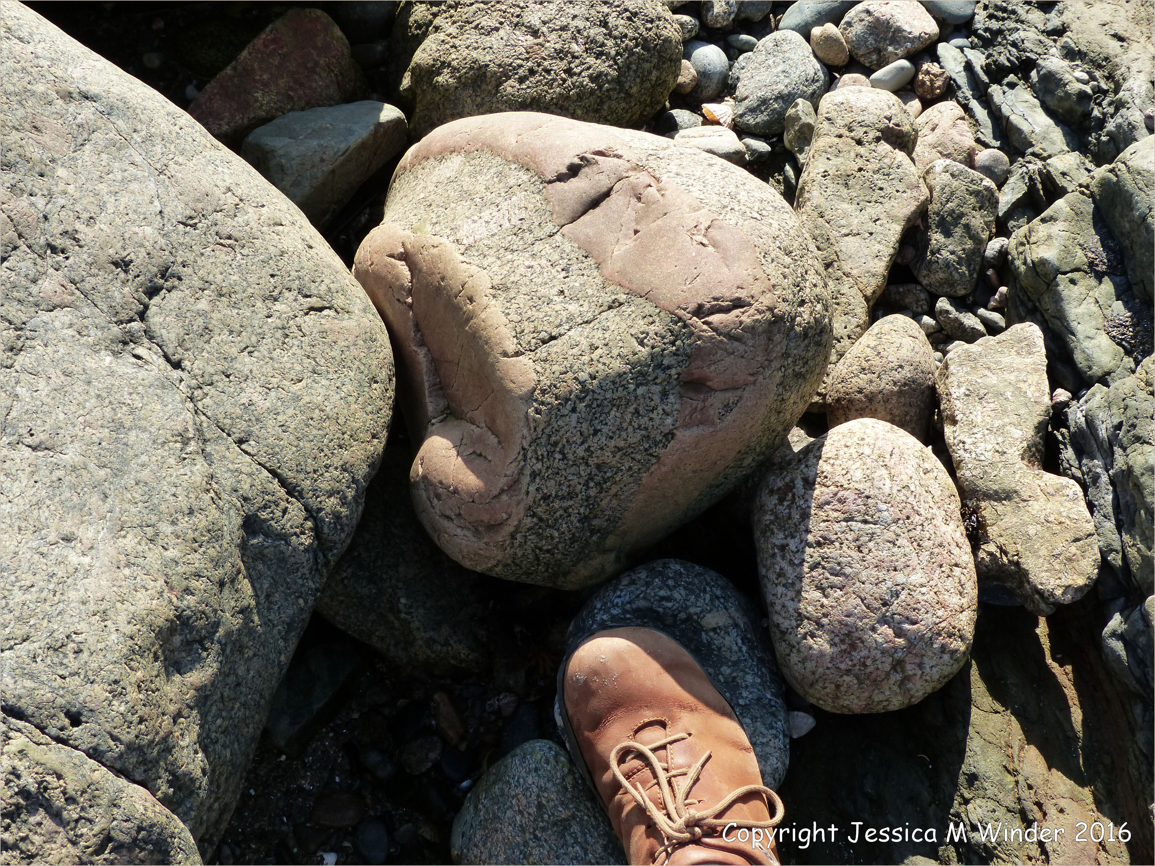 Aplite Vein in L’EreeGranite 7 – Pink aplitic vein in L’Eree Granite boulder on the shore between Lihou Island and the L’Eree Headland on the Channel Island of Guernsey. Foot included for scale.