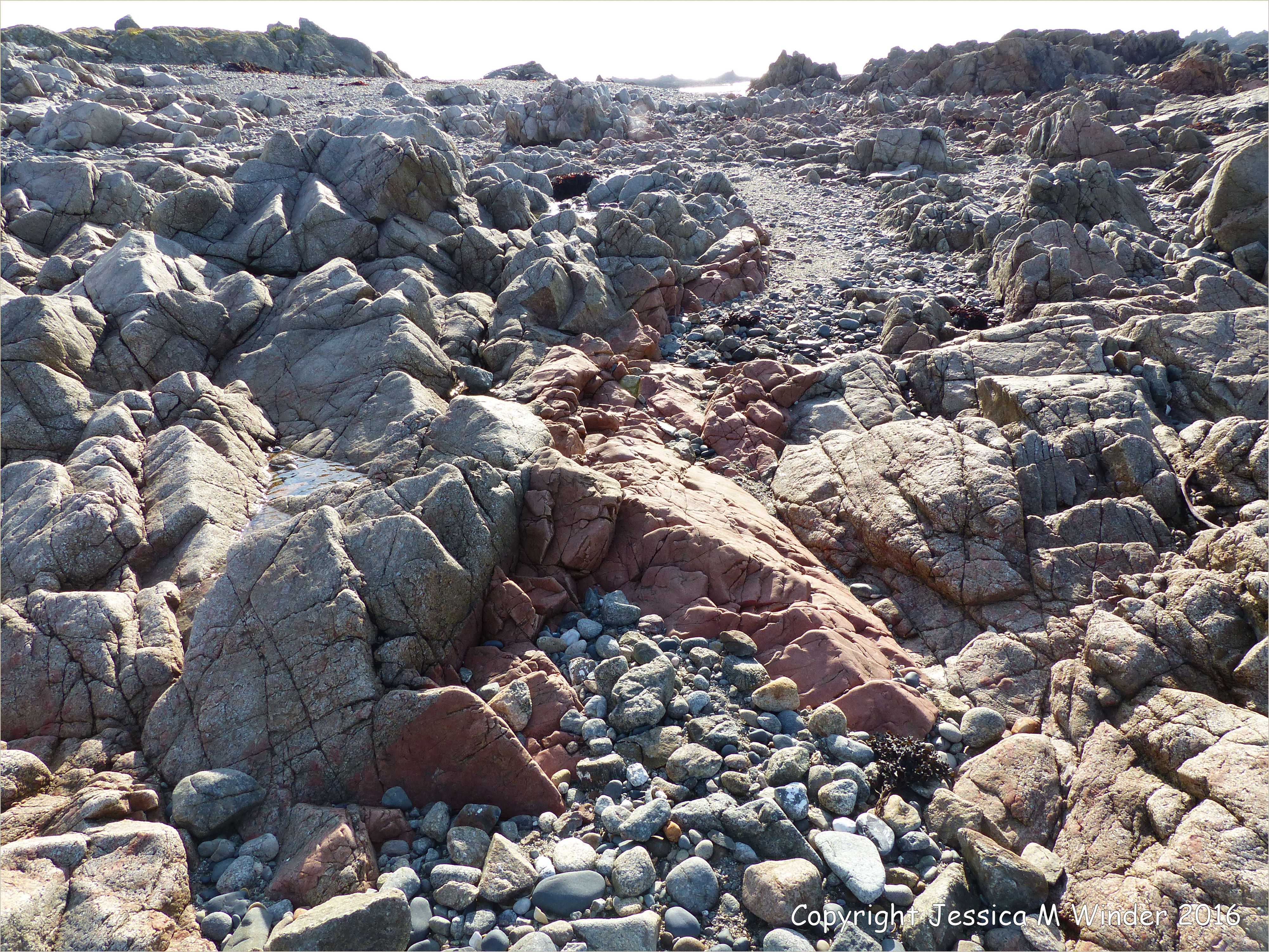 Aplite Vein in L’EreeGranite 6 – Broad pink aplitic vein in L’Eree Granite on the shore between Lihou Island and the L’Eree Headland on the Channel Island of Guernsey.