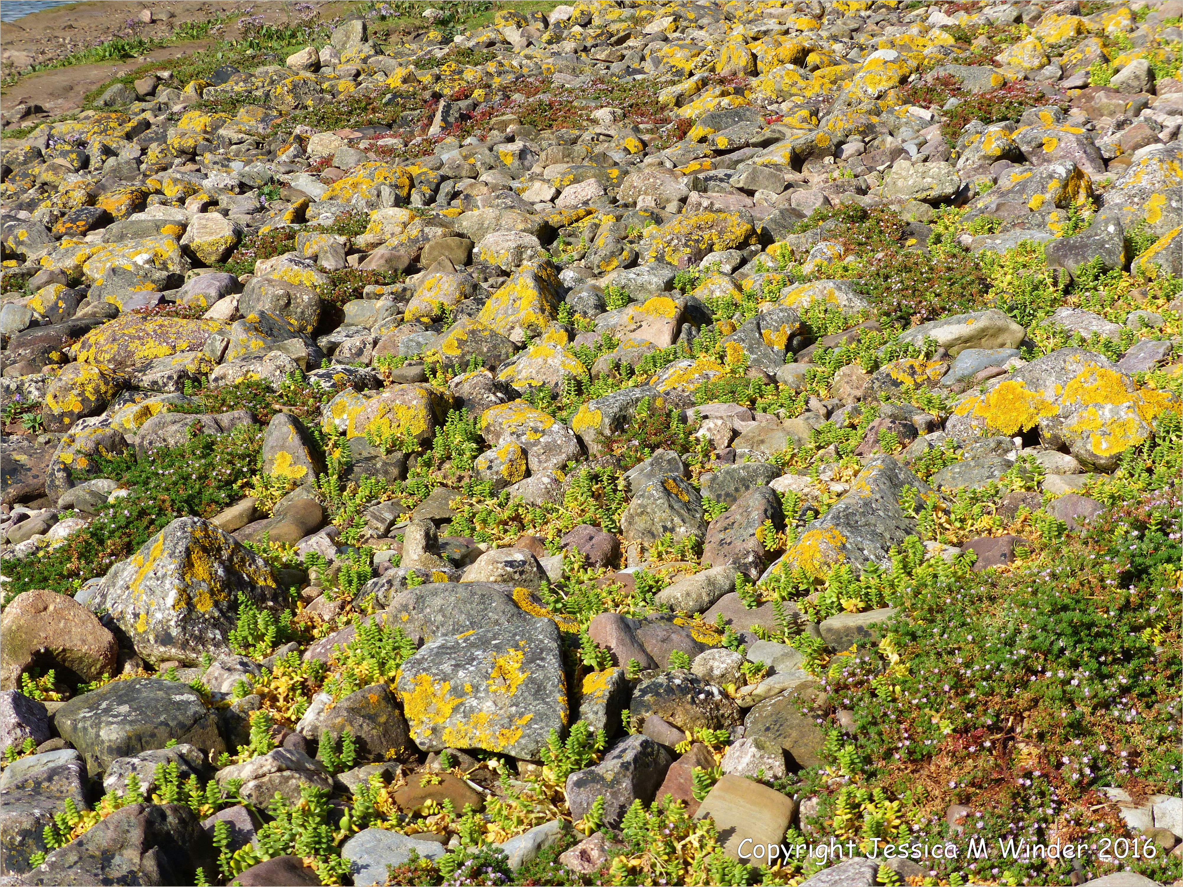 Pennard Pill Pebble Bank 5 – Lichens and flowering plants colonising The Pennard Pill stony west riverbank at Threecliff Bay, Gower, South Wales.