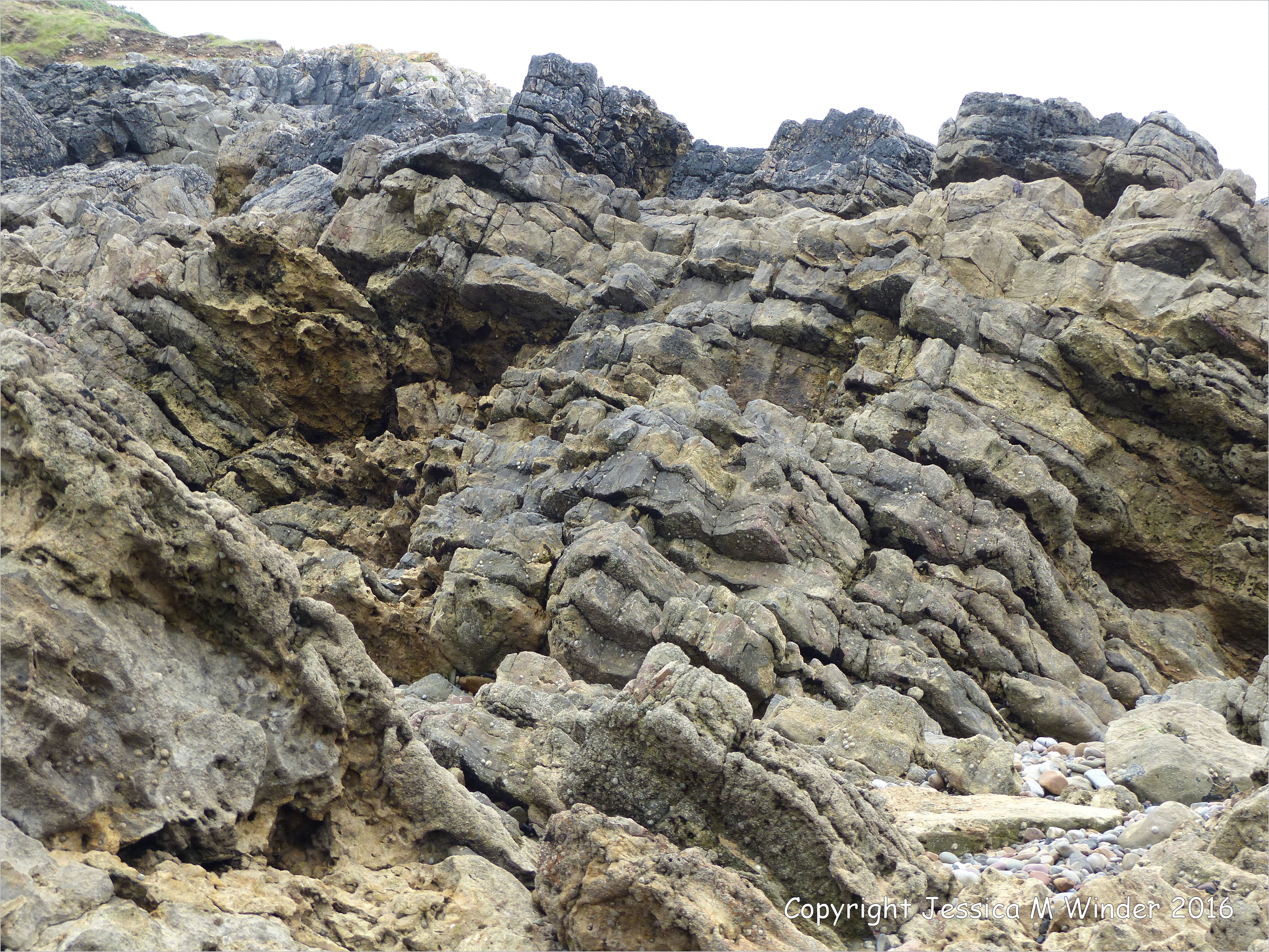 Langland Rock Formations 2 – Carboniferous limestone rock formation at Langland Bay, Gower, South Wales, showing dipping strata.