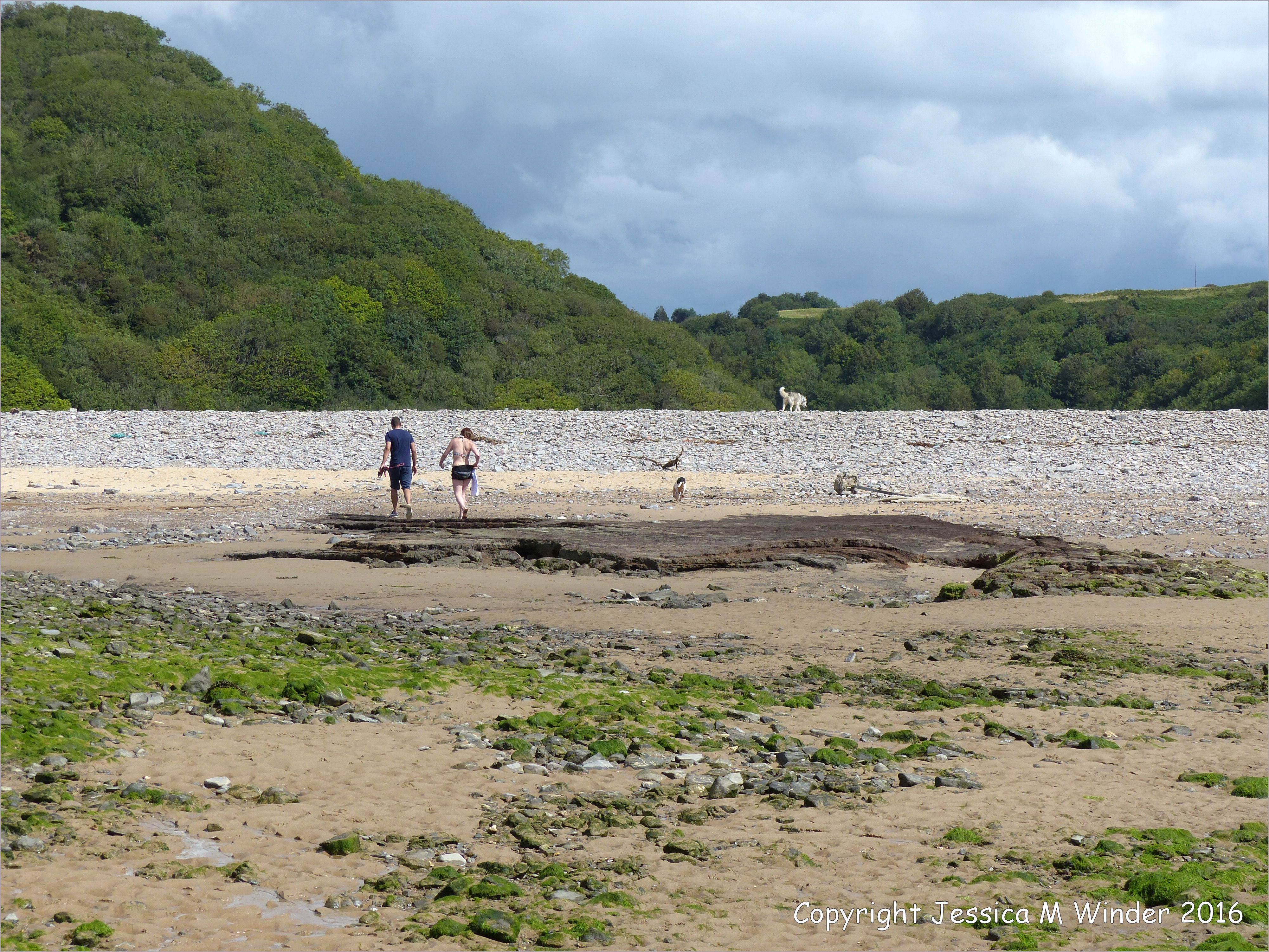 Peat at Threecliff Bay 1 – Ancient Holocene peat bed exposed beneath the pebble storm beach in the Pennard Pill valley leading to Threecliff Bay in Gower, South Wales. View looking north.
